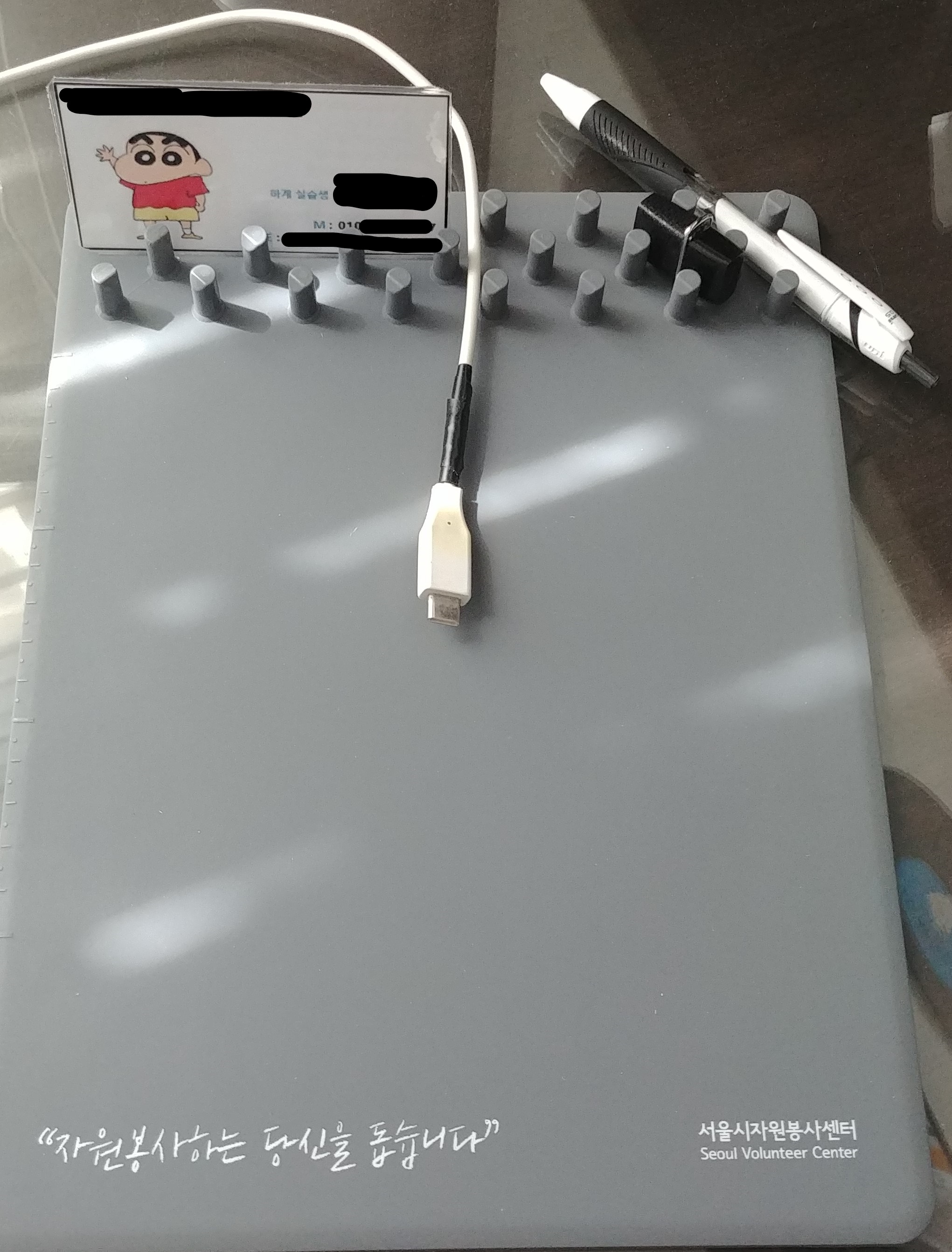 어떻습니까. 비슷하나요? 명함, 충전선, 볼펜, 유에스비, 그리고 무엇인지 모르는 물건들이 놓여 있는데, 최대한 비슷하게 만들어 봤습니다. 오른쪽 사진 왼쪽에 보이는 짱구는 제 명함인데, 사회복지 현장실습을 하며 만들었던 명함입니다. 명함, 볼펜, 유에스비, 충전선을 수납해 봤습니다. 대충 이런 식으로 사용하면 되는 것 같습니다. 여기에 마우스만 얹으면 됩니다.