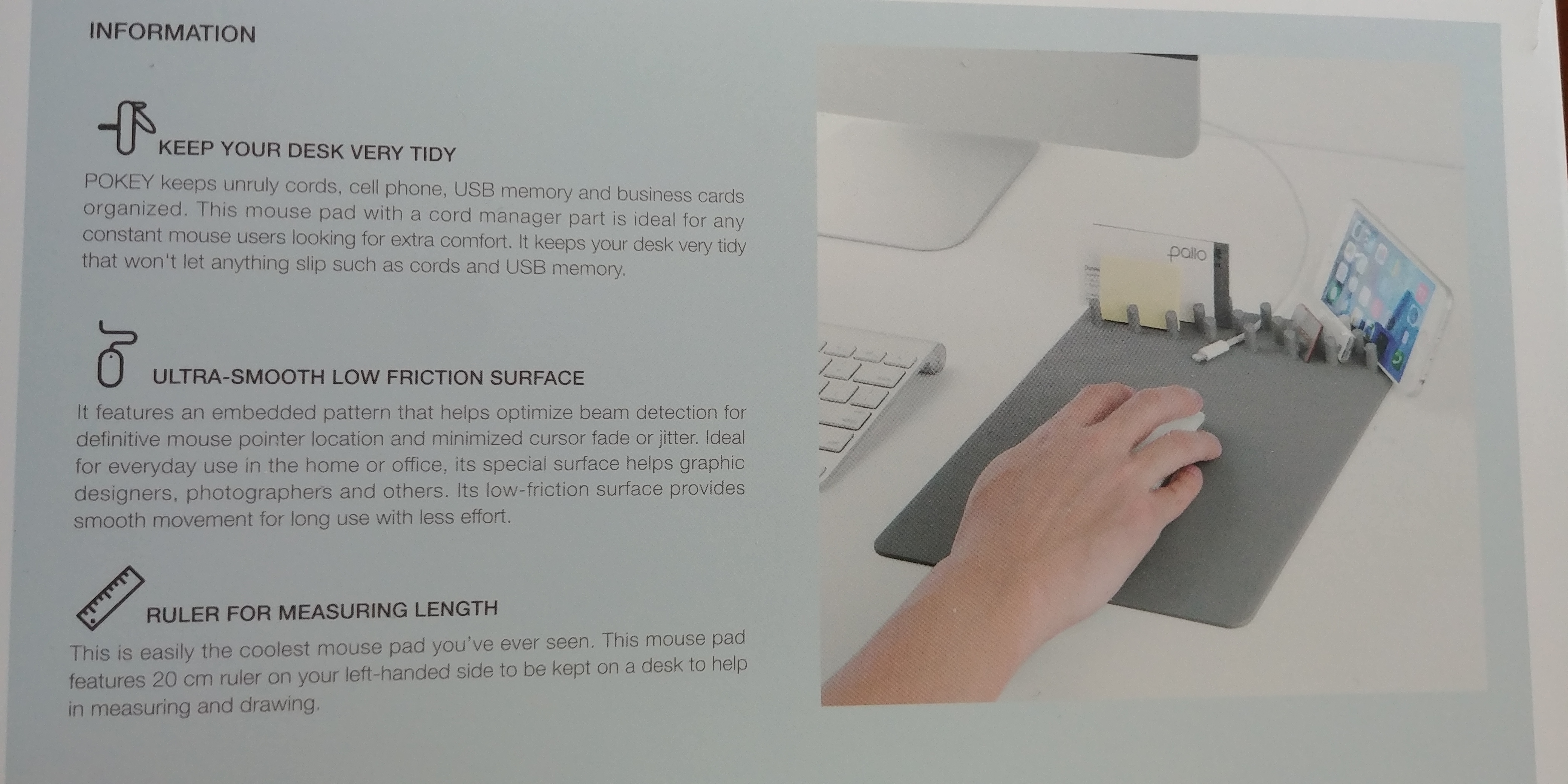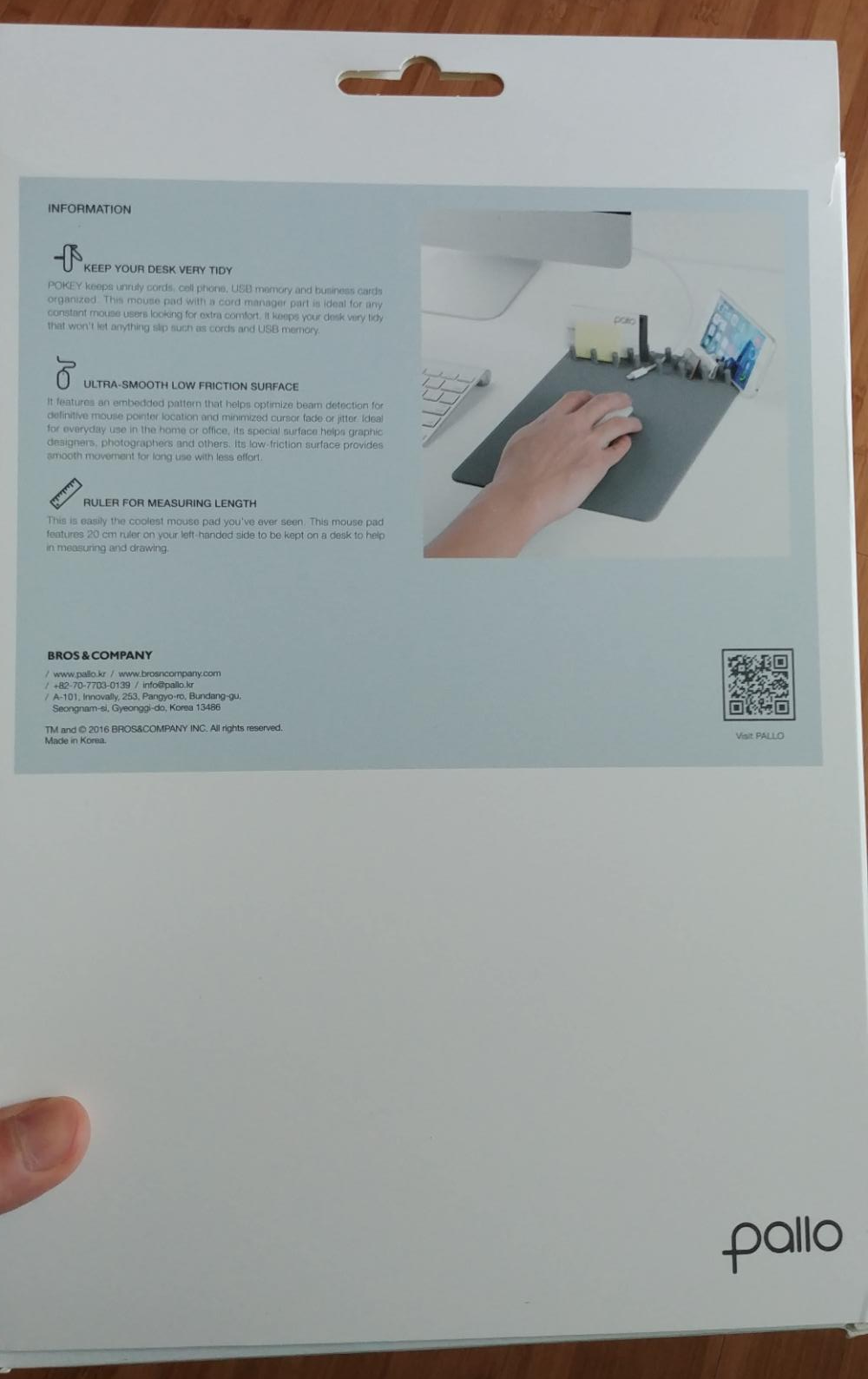 '포키'라는 뜻이 포켓(주머니)이라는 단어에서 파생돼서 주머니처럼 수납이 편리한 마우스패드라는 이야기인 것 같습니다. pallo라고 쓰여있는데, 이건 이 제품을 만드는 회사 이름 같습니다.