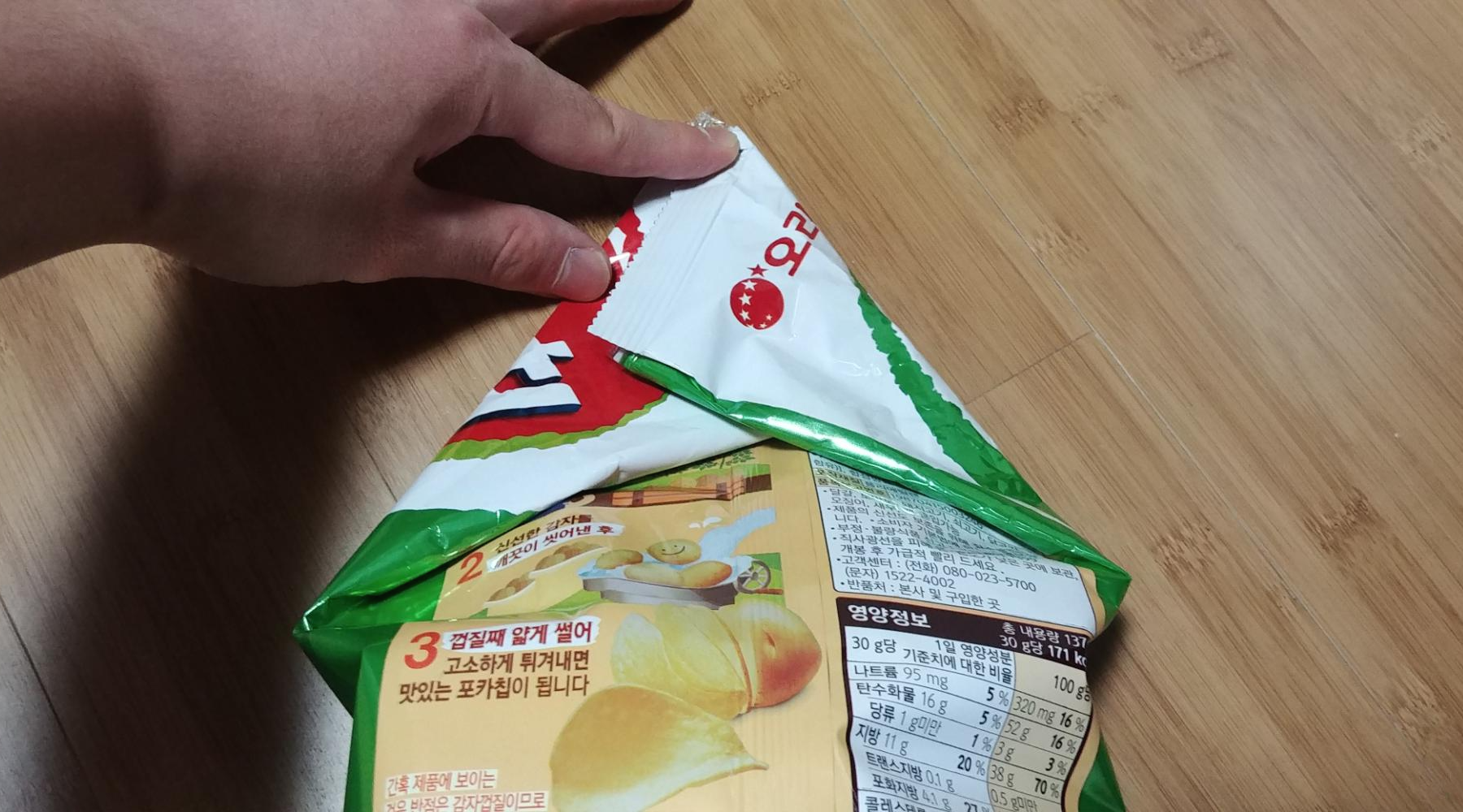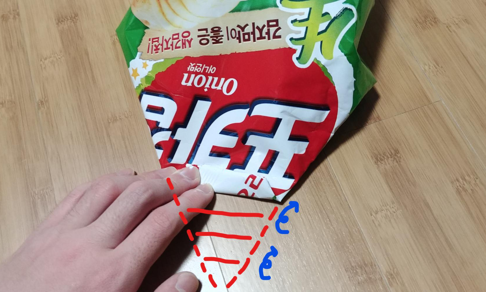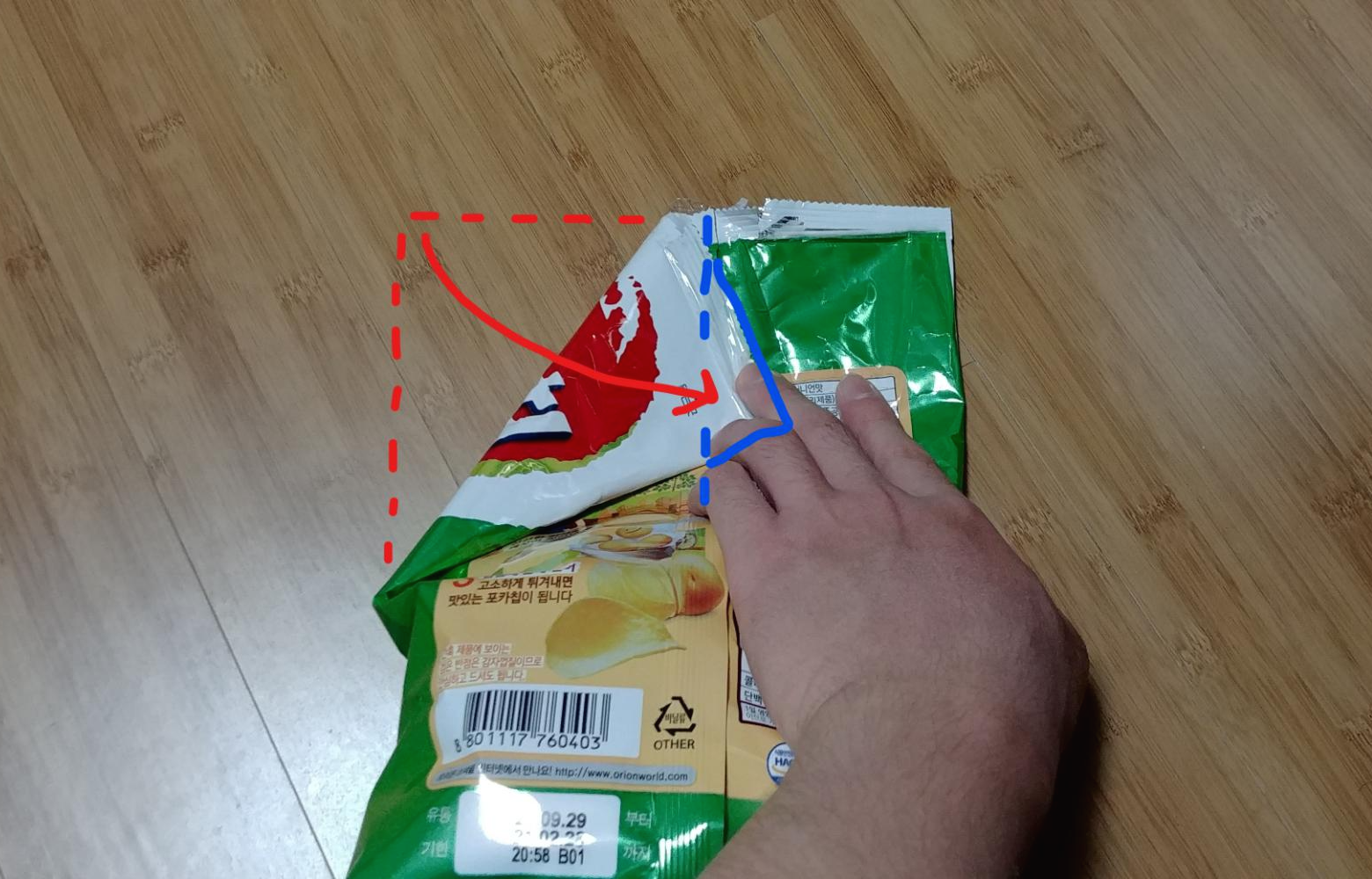 위 사진처럼 과자봉지 왼쪽 위 모서리가 중앙을 넘어가게끔 접어야 합니다.