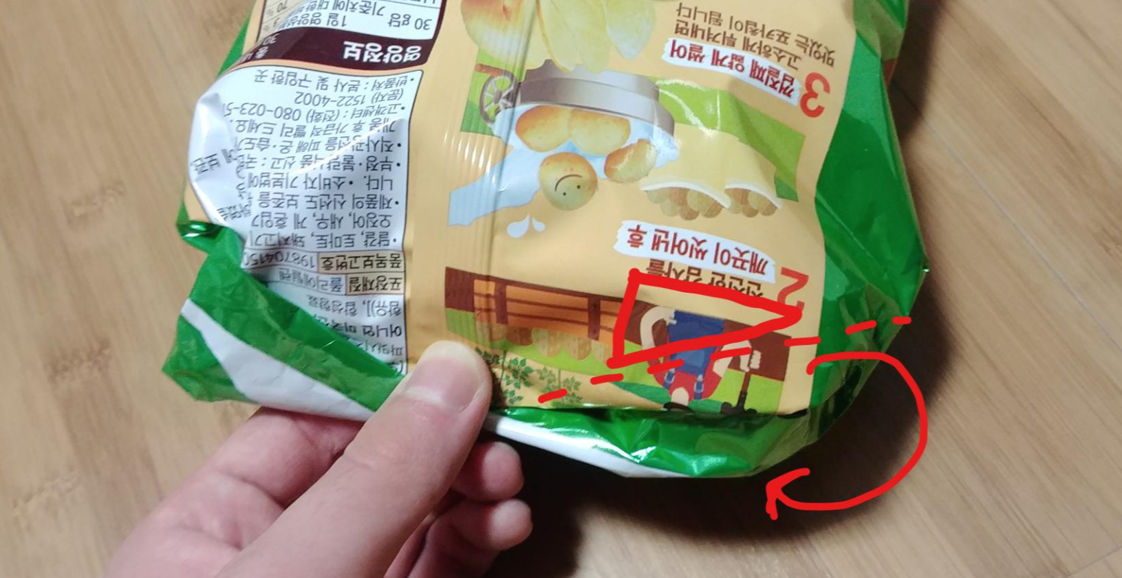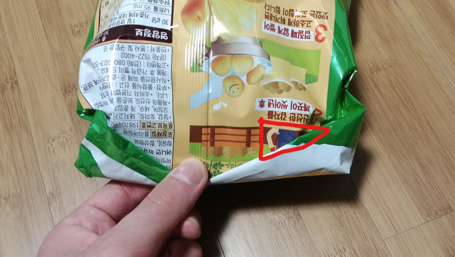 과자봉지를 앞뒤 기준으로 뒤집고, 방향도 위아래가 바뀌게 뒤집어줍니다.