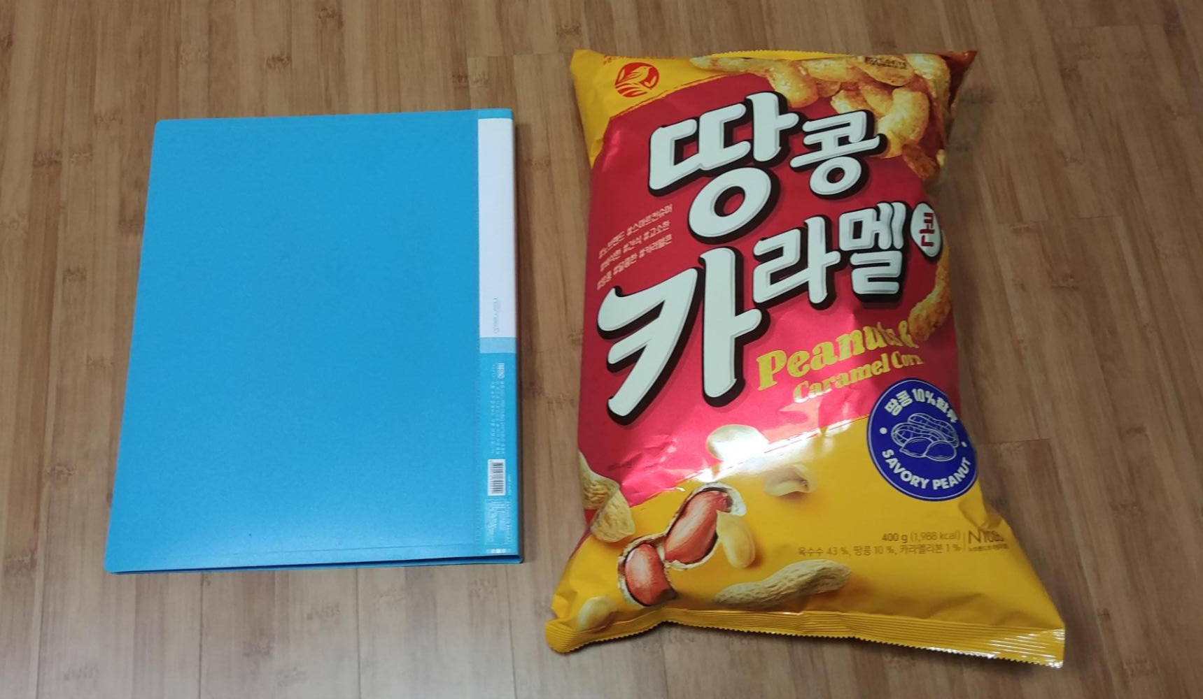 원래는 영양정보를 바로 살펴보려 했으나, 크기를 언급하지 않으면 안될 것 같아서 크기 비교를 해봤습니다. A4용지를 껴놓는 클리어 파일보다 훨씬 큽니다. 위에서도 말씀드렸다시피 무슨 베개만큼 큽니다.