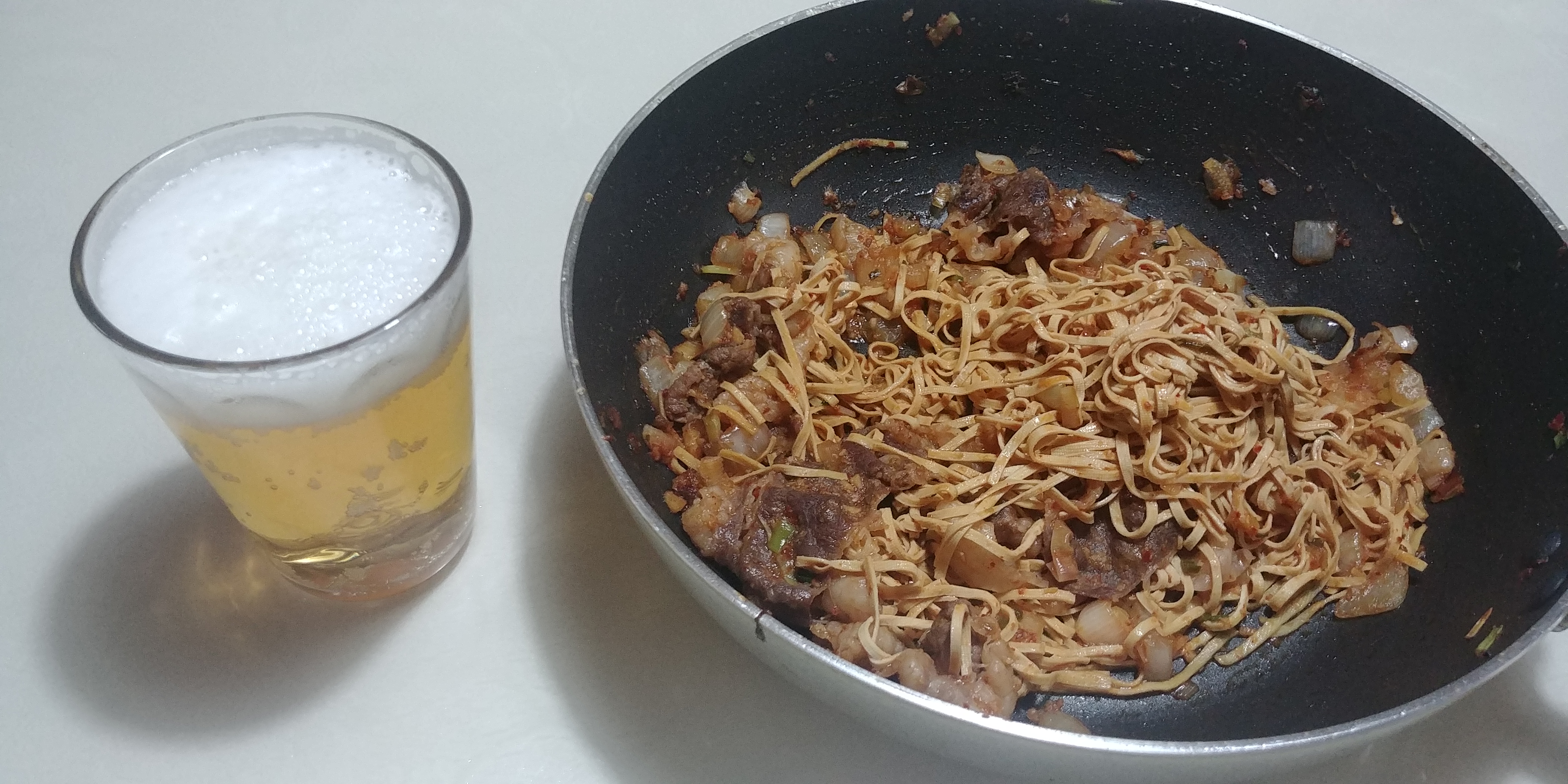 하지만 기름진 음식을 먹을 때에는 역시 라거 맥주가 최고입니다. 위의 사진은 풀무원 두부면을 이용해서 건두부 볶음면을 만든 것인데, 이 안주와 먹으니 맥주가 술술 넘어갑니다.