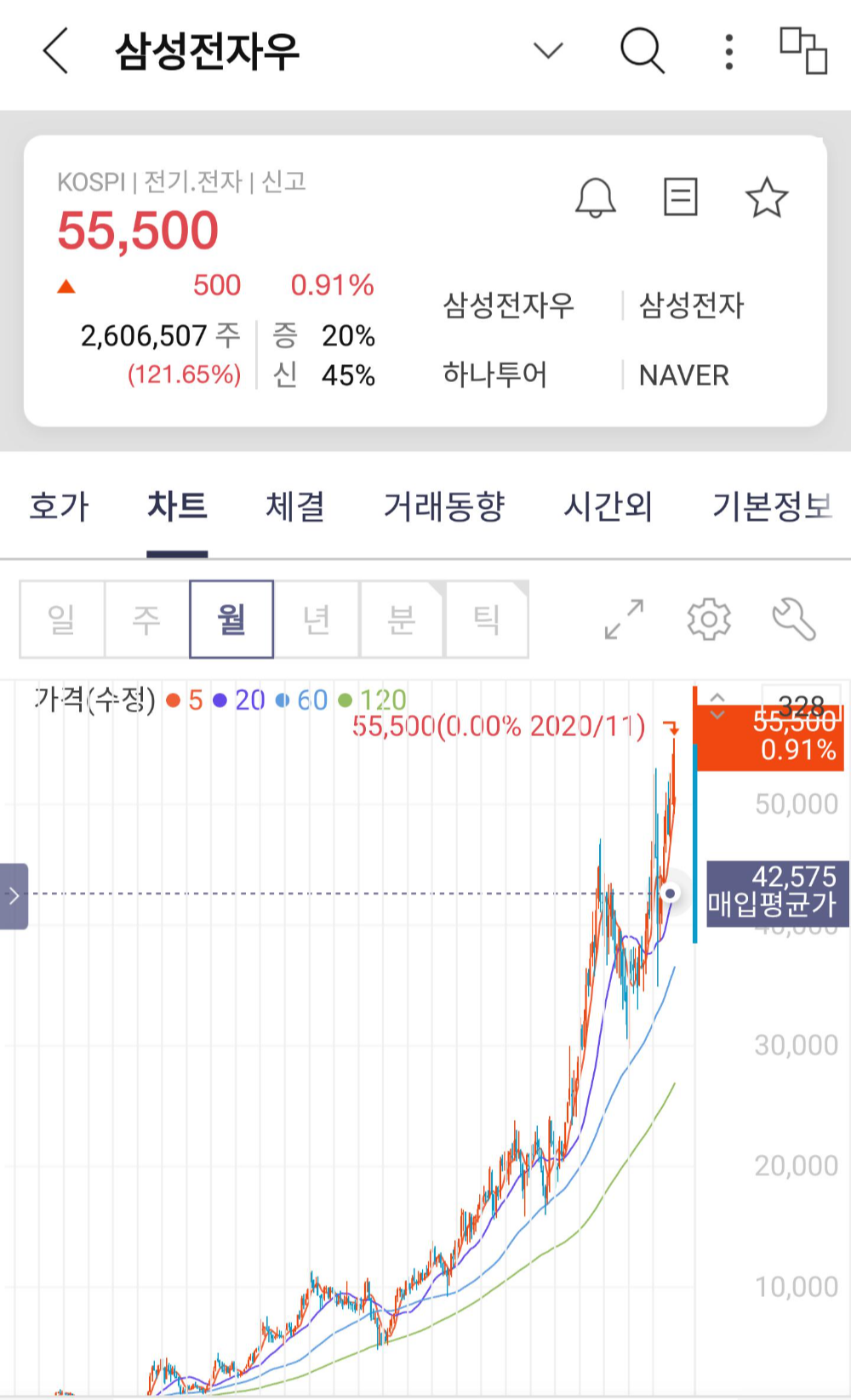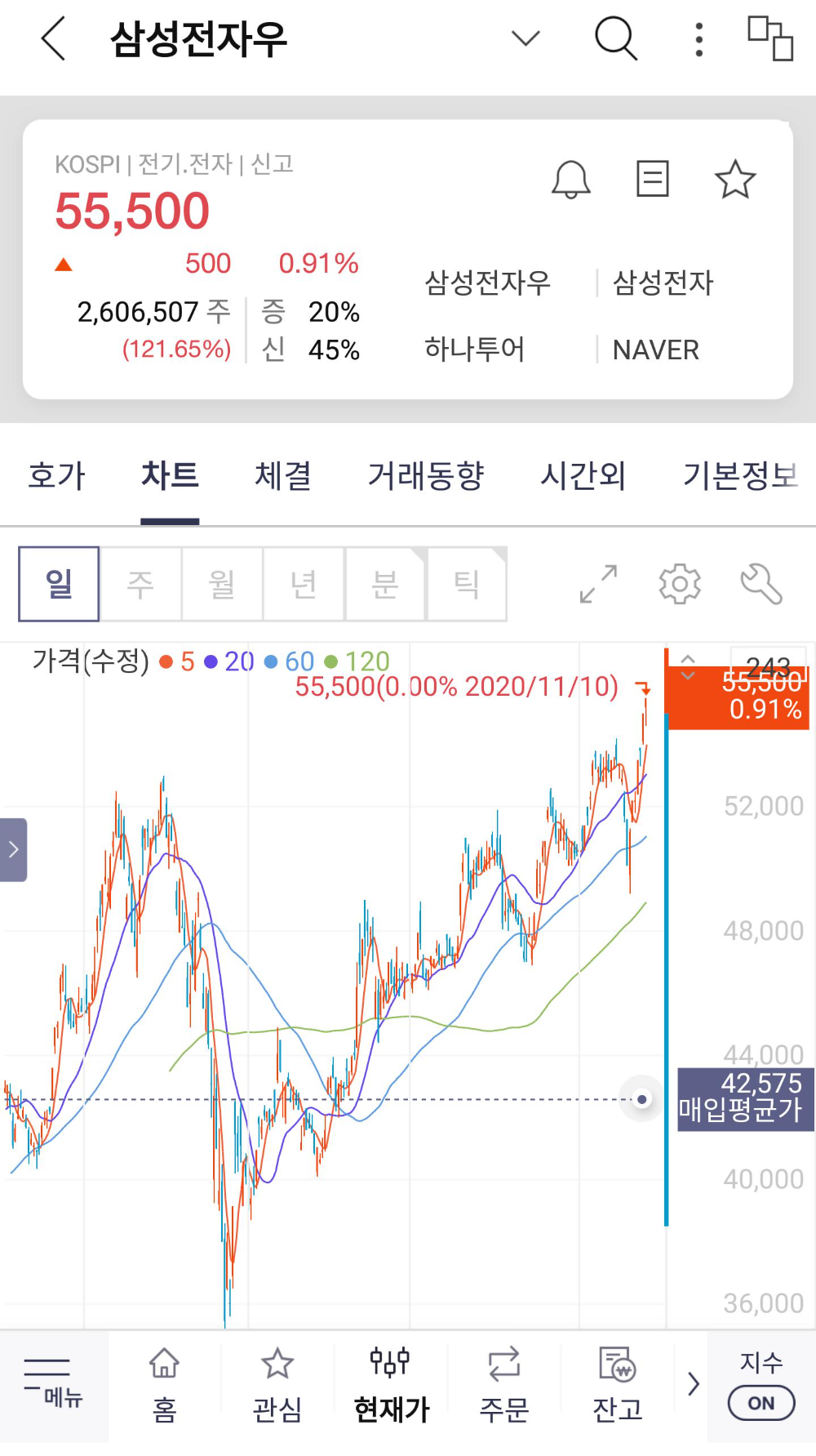 위의 삼성전자우 일봉 차트를 보시면 아시겠지만, 제가 삼성전자우를 한 주당 42,575원에 매수했습니다.