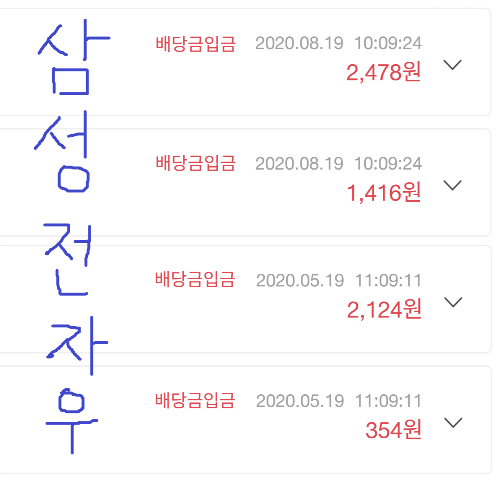 분기별 배당이기 때문에 그렇게 많은 금액은 아니지만, 위의 사진을 보시면 제가 삼성전자우를 매수함으로써 받게 된 배당금 내역을 보실 수 있습니다(삼성전자 배당금도 포함되어 있습니다).