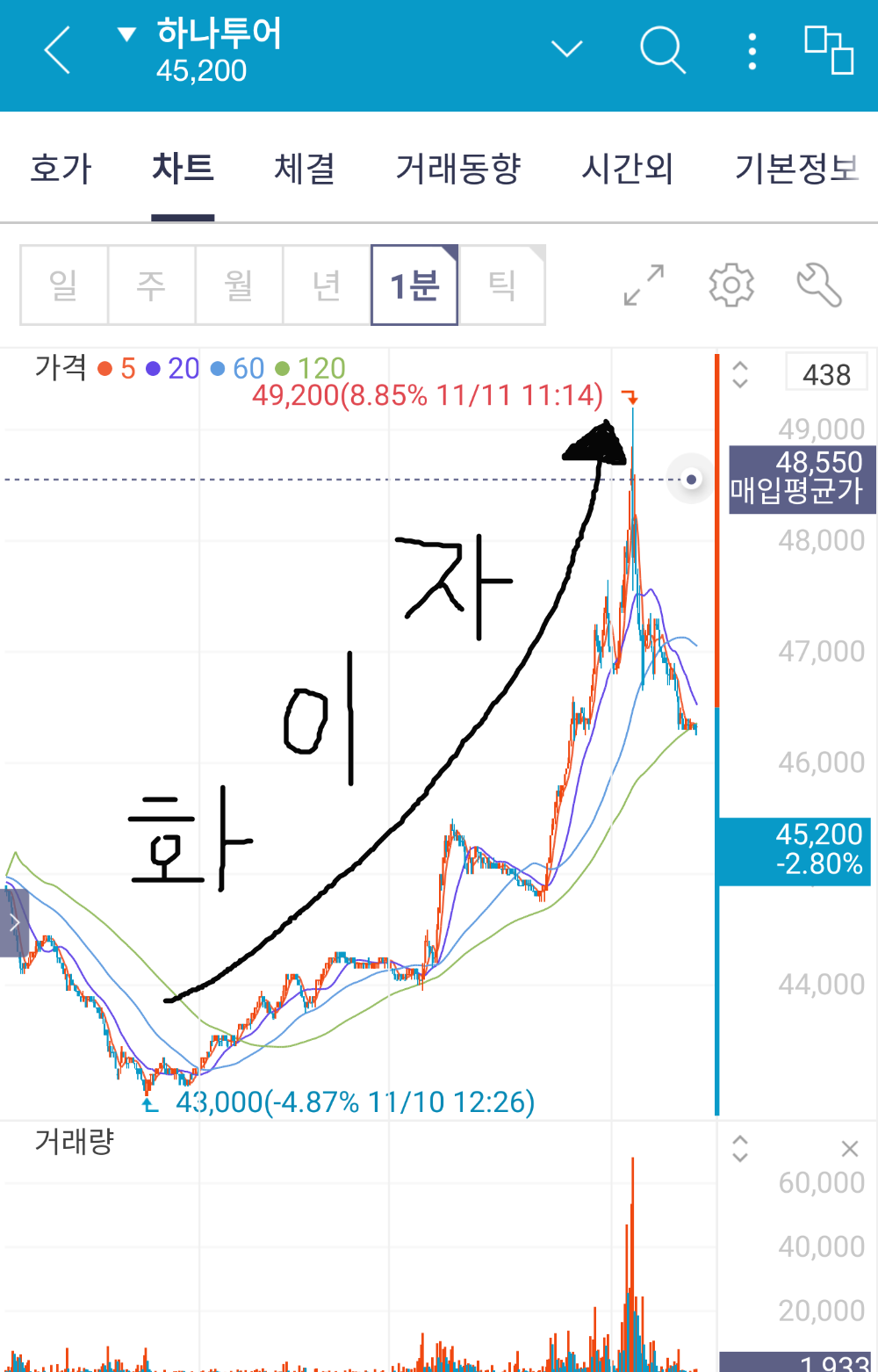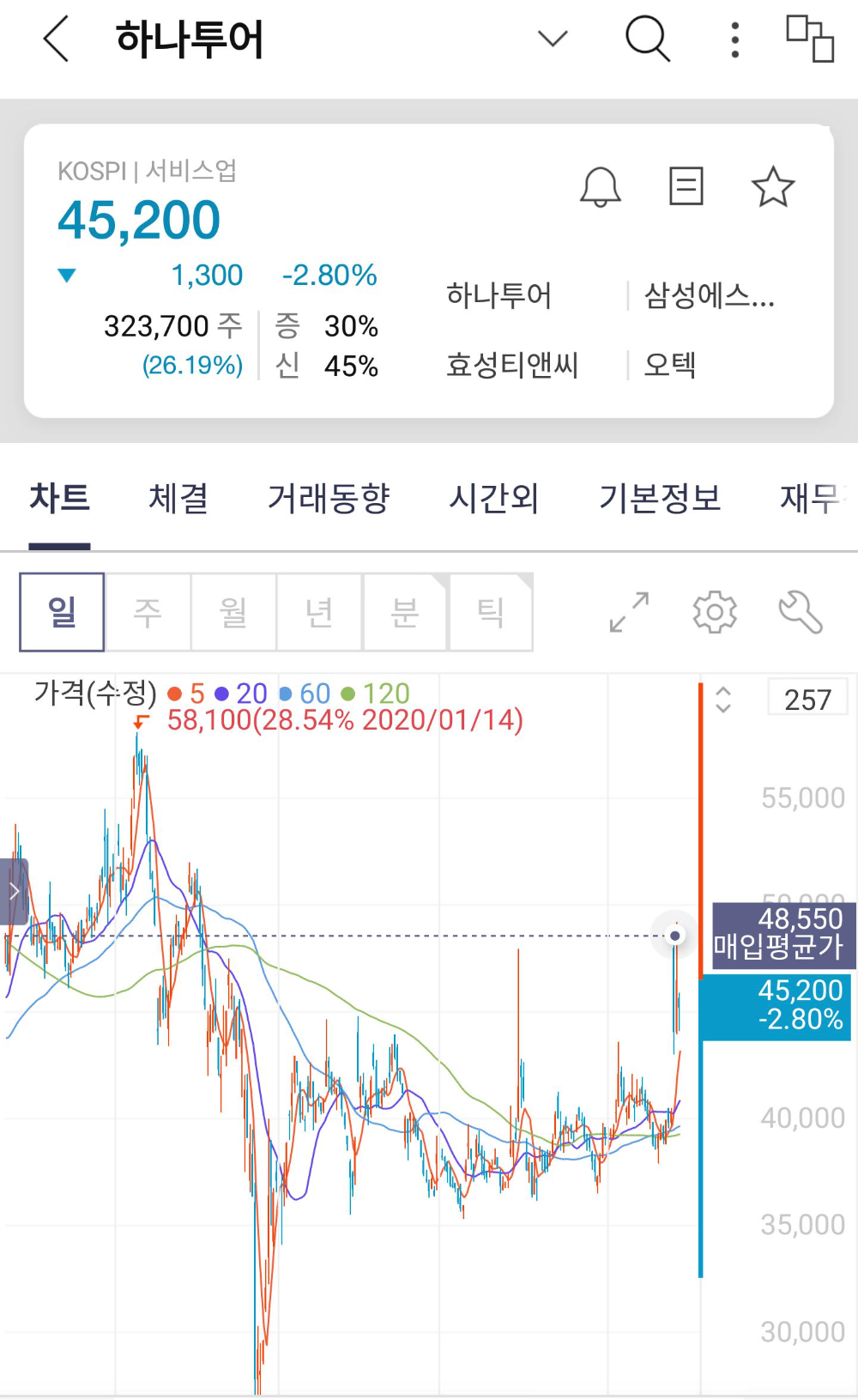 어느새 보니 저의 하나투어 매입 평균단가인 48,550원을 터치하고 내려갔습니다.