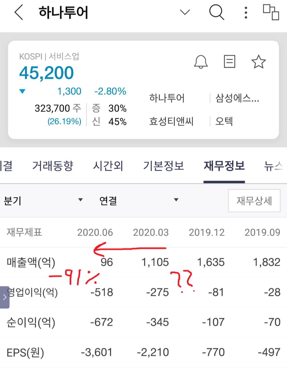 이미 영업이익이 분기마다 마이너스고 그 마이너스가 두 배로 증가하고 있는 상황에서, 정석대로 재무제표를 분석하여 투자하는 것은 옳지 않다고 생각합니다(위의 재무제표만 보면 하나투어 주가 전망이 정말 암울합니다).