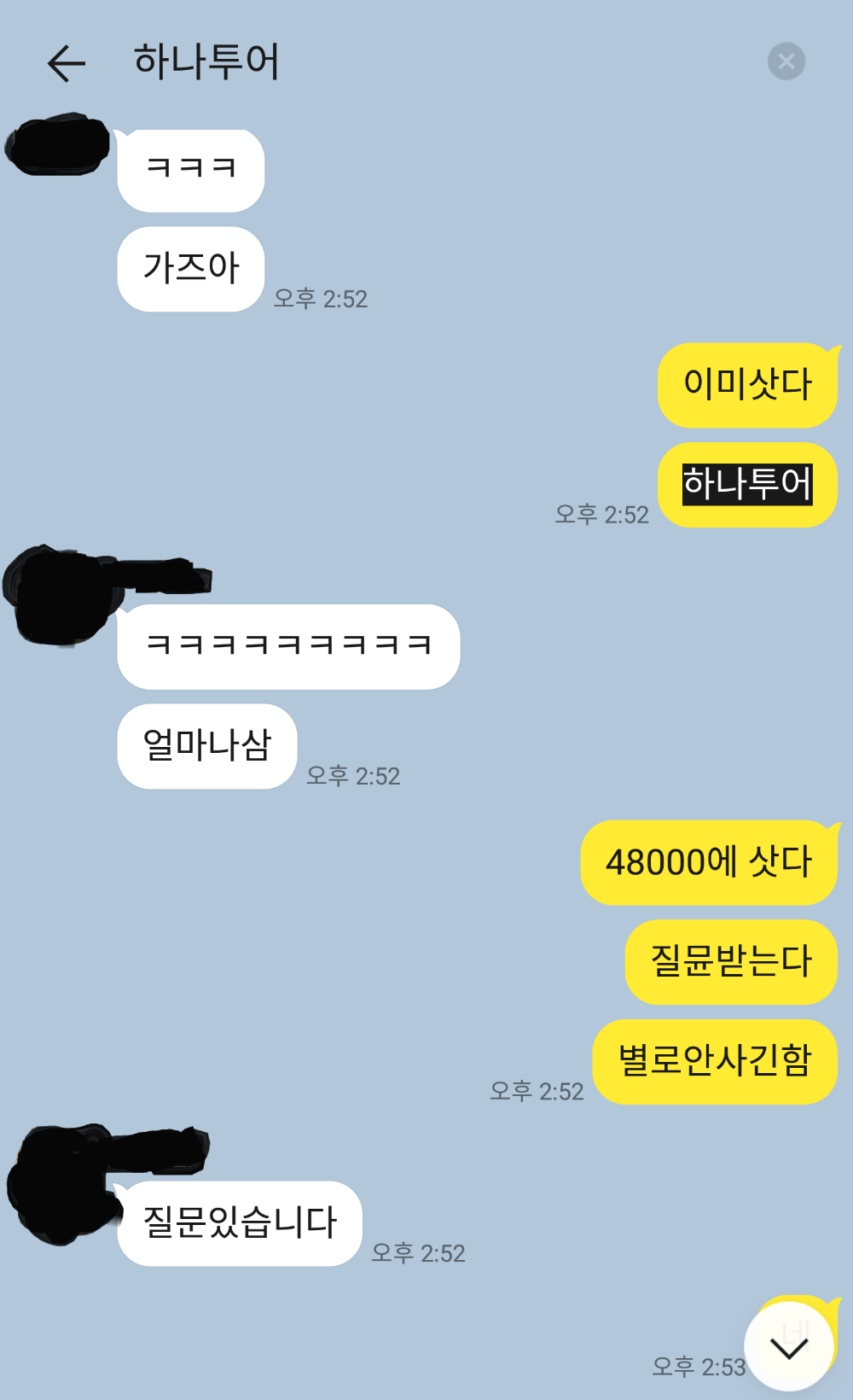 저는 친구들에게 그저 장난치듯이 하나투어에 들어갈 거냐고 묻기만 했습니다.