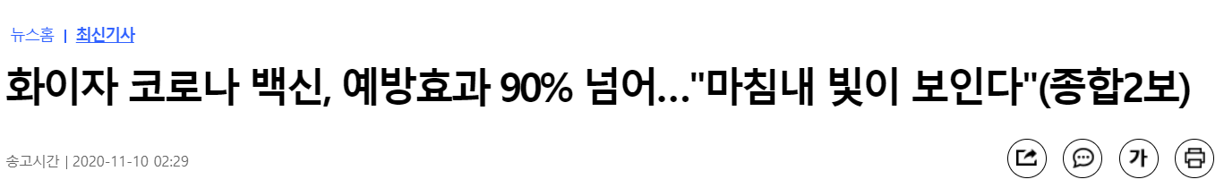 화이자 코로나 백신, 예방효과 90% 넘어…"마침내 빛이 보인다"(종합2보), 강건택기자, 국제뉴스 (송고시간 2020-11-10 02:29)