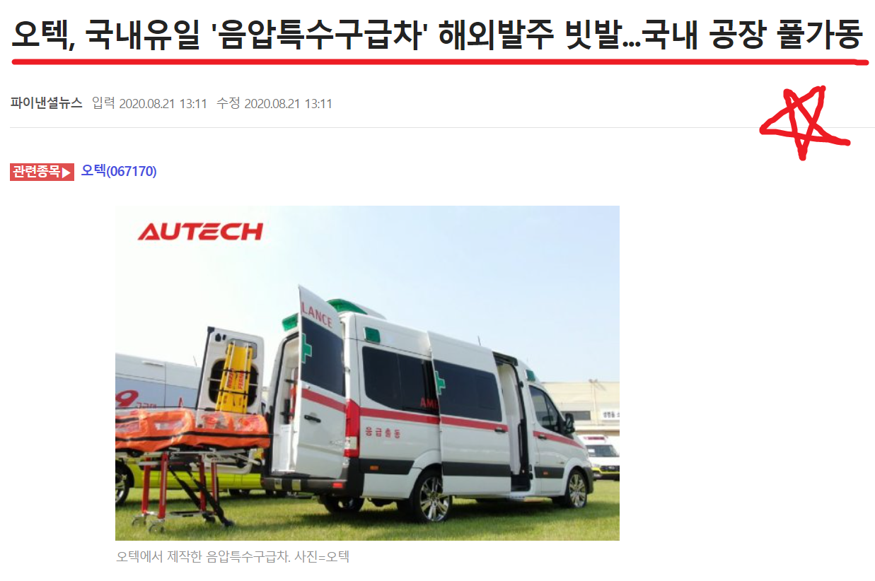 또한 위의 기사에서 보았듯이, 음압특수구급차 해외 발주가 빗발친다는 것은 오텍이 대외적으로도 유명하다는 것을 알 수 있습니다.