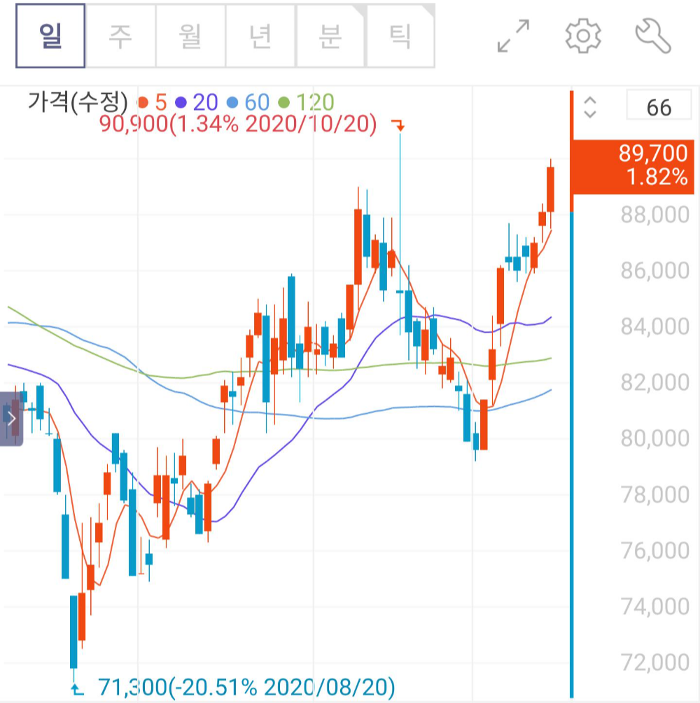 아까 위의 차트에서 2018년에 SK하이닉스 주가가 97,700원까지 갔던 것을 확인했는데, 지금은 2020년 4분기니까 주가 전망이 밝은 SK하이닉스의 주가는 더욱 올라가있겠죠?