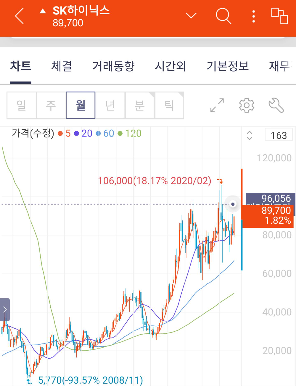 위의 SK하이닉스 월봉 차트를 보시면, 주가가 많이 오르긴 했지만 그 상승 폭이 삼성전자보다 훨씬 덜합니다.