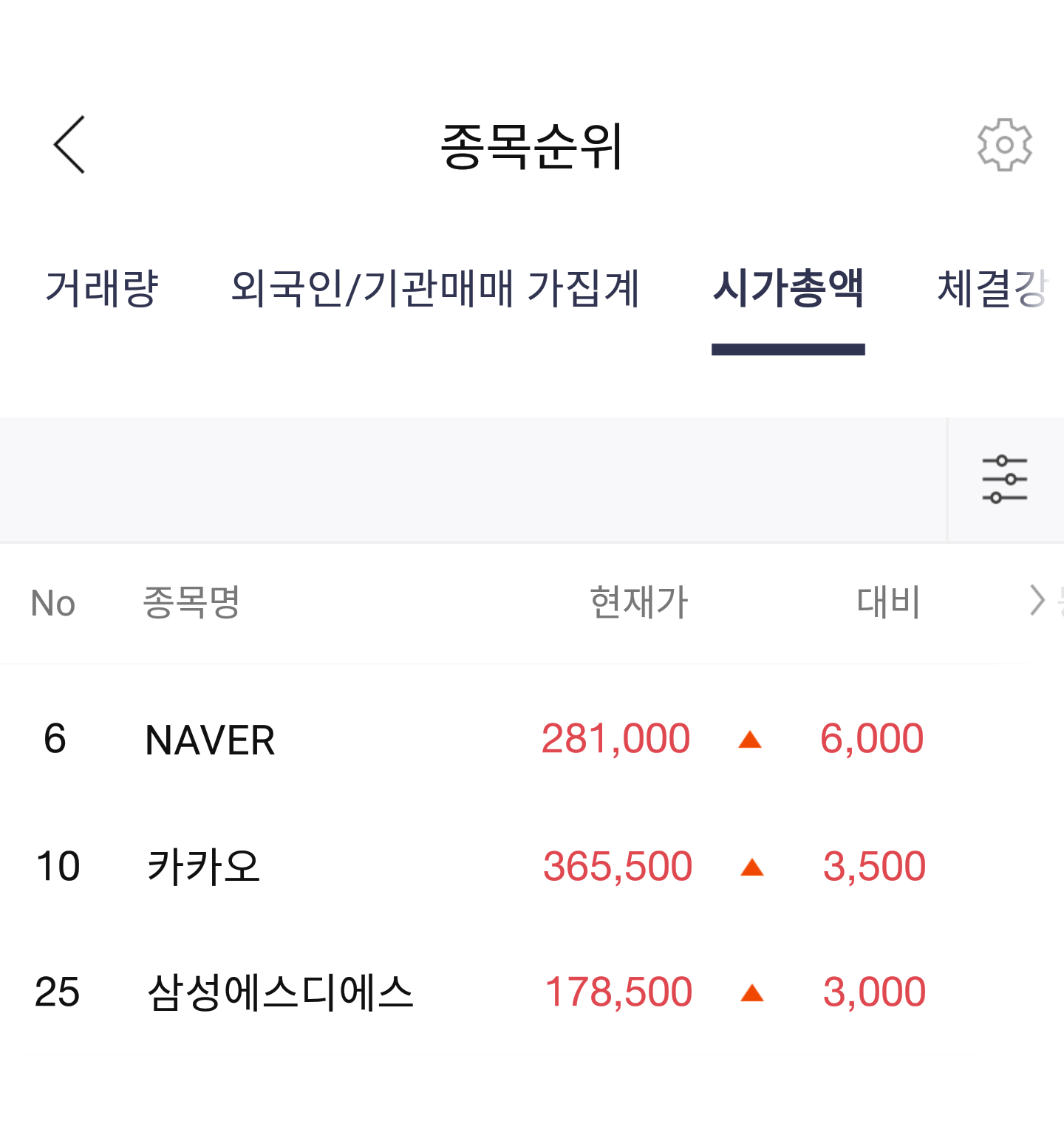 그렇다면 세 기업의 시가총액 순위는 어떠한지 한 번 살펴보도록 하겠습니다.