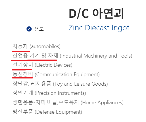 하지만 위의 사진을 보면 아연이 자동차, 산업용 기계 및 자재, 전기장치, 통신장비 등에 사용된다는 것을 알 수 있습니다.