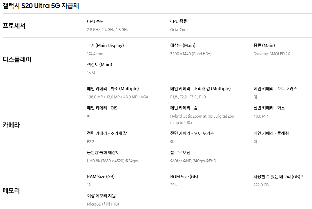 이제 갤럭시 S20 울트라 블랙의 세부적인 스펙을 말씀드리겠습니다.