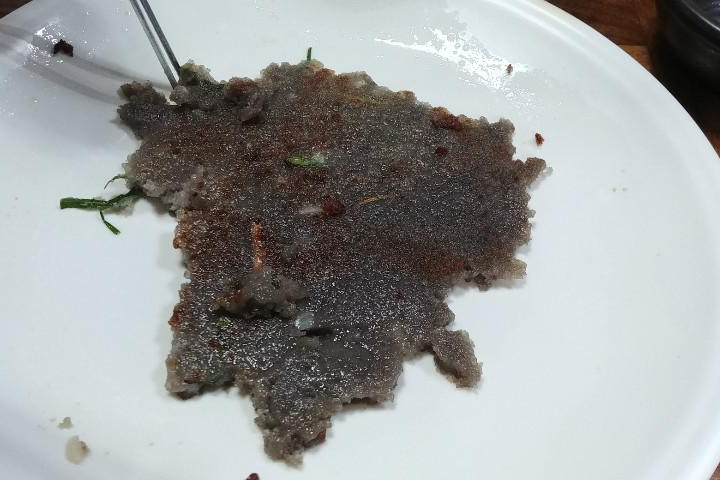 메뉴판에는 연한 갈색 느낌의 감자전이 그려져있었는데, 감자에게 무슨 일이 생겼는지 진한 갈색 감자전이 됐습니다.