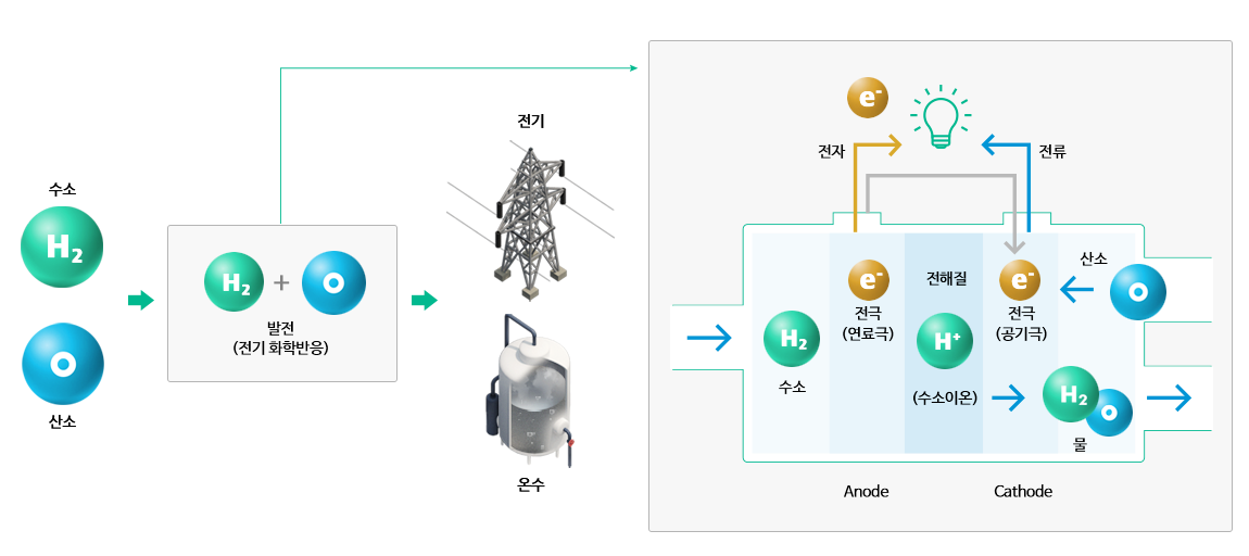 "수소와 산소의 화학반응을 이용하여 전기를 생산하는 친환경 수소 발전 기술입니다."