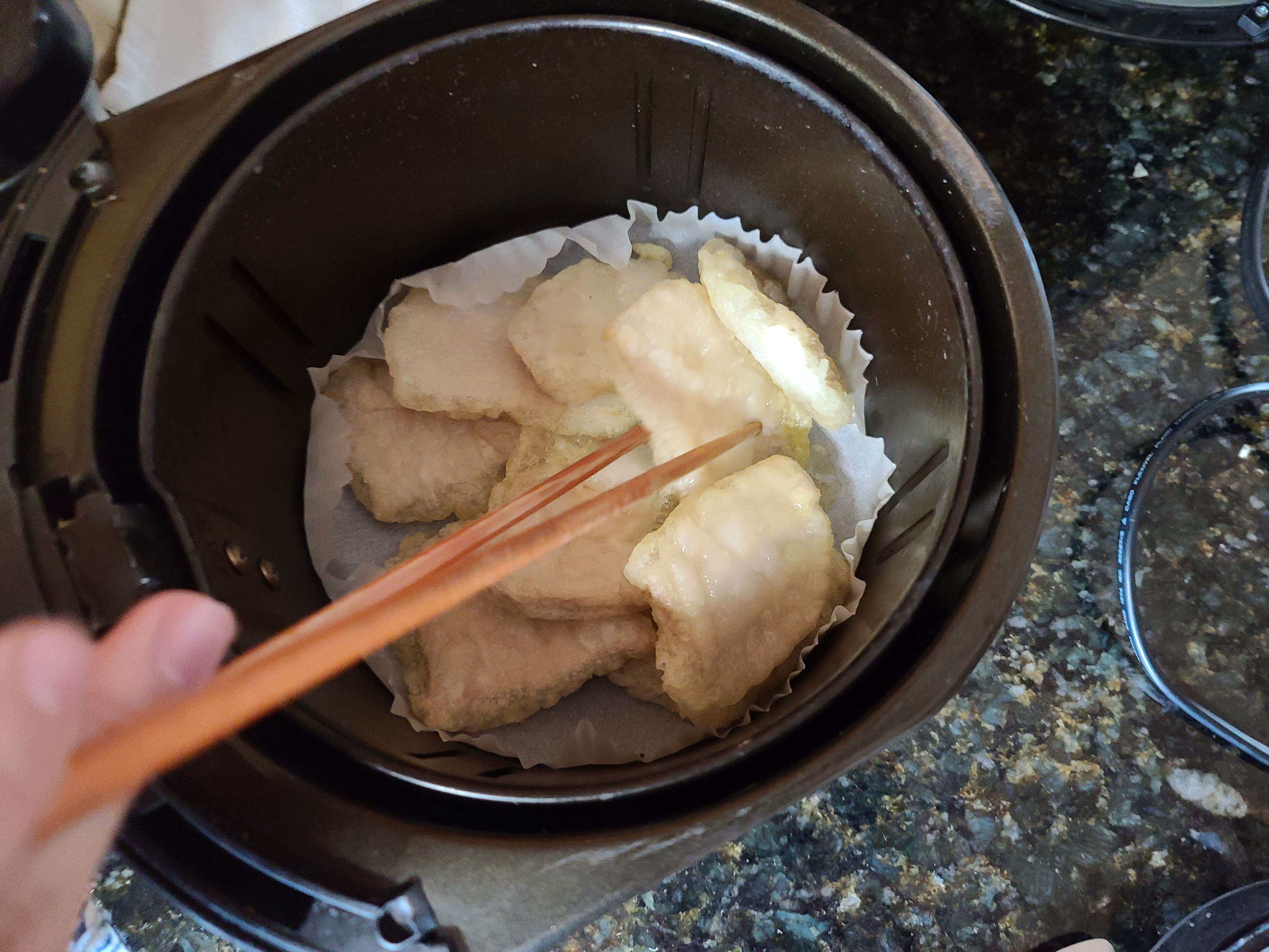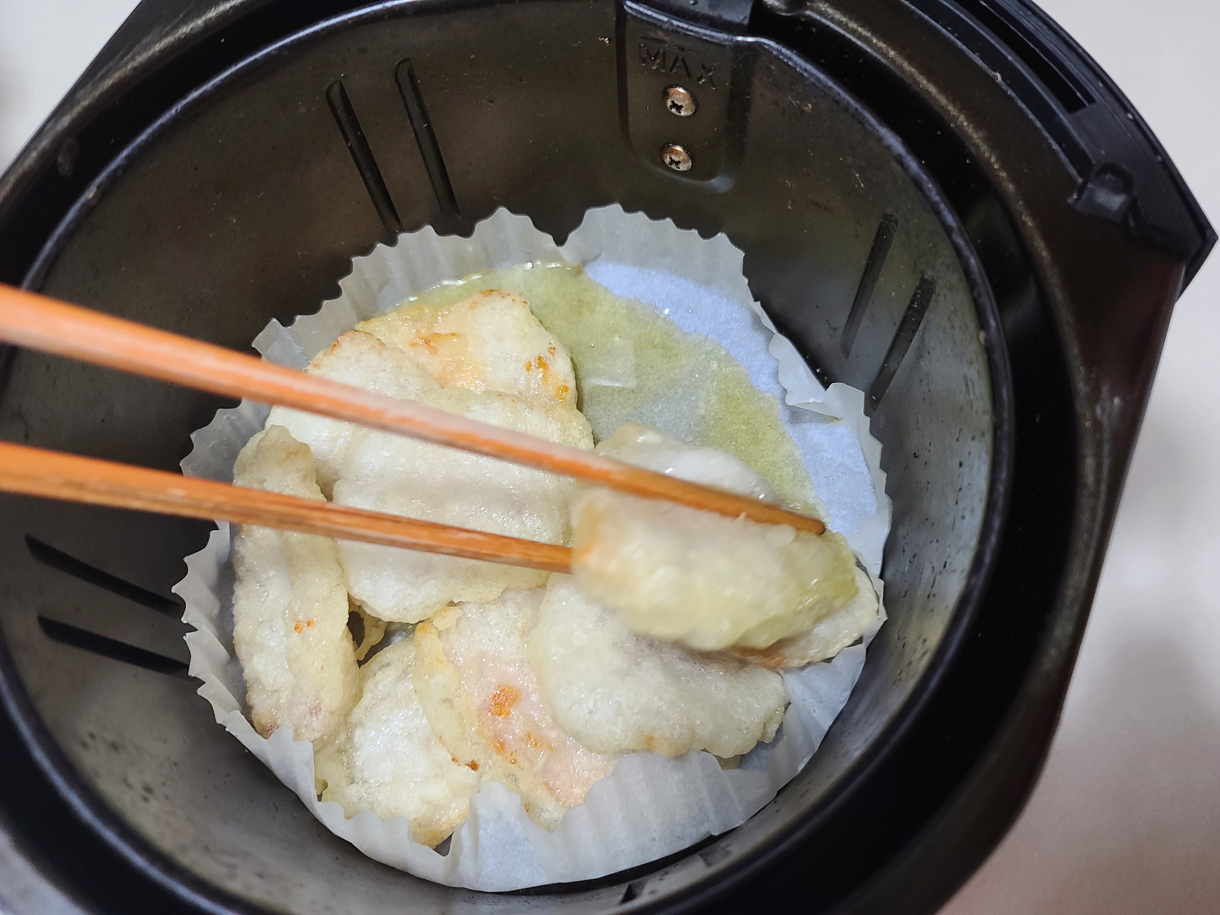 먼저 에어프라이어에 종이호일을 깔고 피코크 정통 꿔바로우를 넣어줍니다.