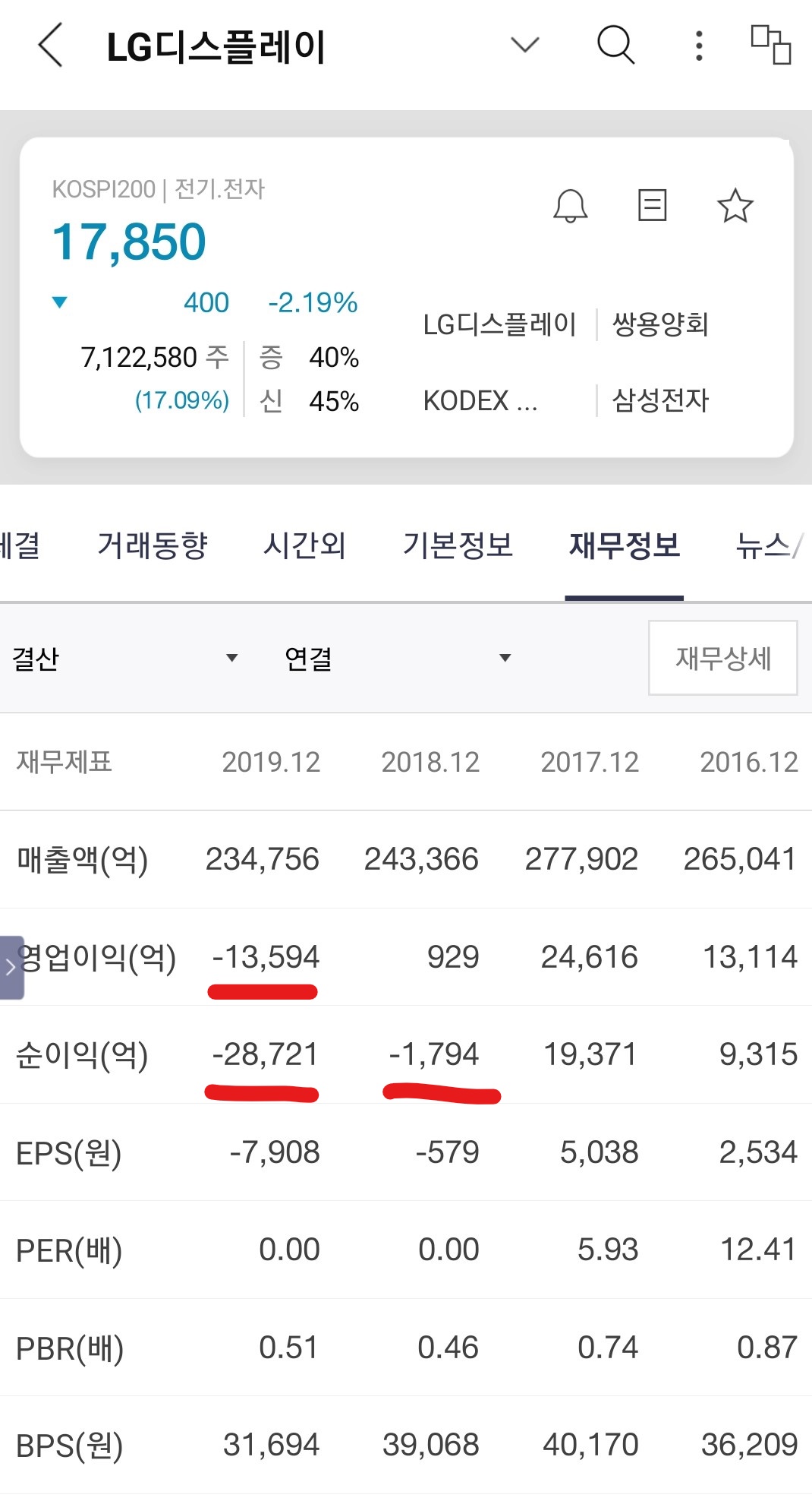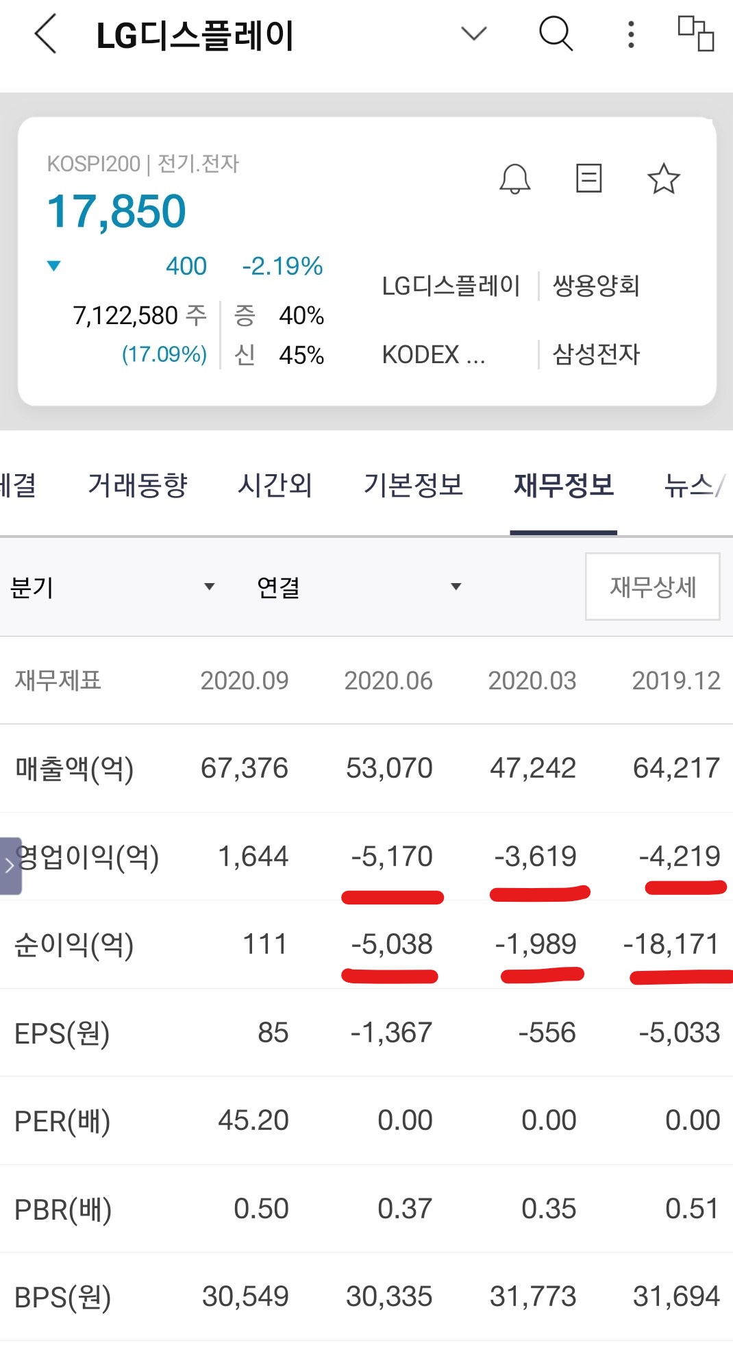 결산 기준으로 봐도, 분기 기준으로 봐도 LG디스플레이의 영업이익과 순이익에 마이너스가 찍혀있다는 것을 볼 수 있습니다.