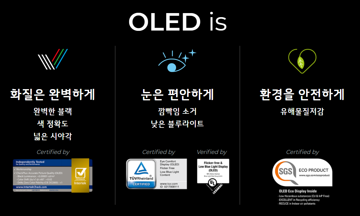 어쨌든 OLED는 자체발광을 하는 특성을 갖고 있어서 현재 최고의 디스플레이로 자리 잡고 있다는 것만 알고 계시면 좋을 것 같습니다.