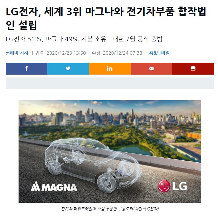 최근에 LG전자가 세계 3위인 전기차부품 기업과 손을 잡았다는 기사가 뜨고 난 후에 LG 계열사들의 주가가 미친 듯이 오른 것을 미루어 봤을 때,