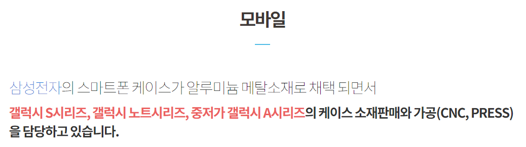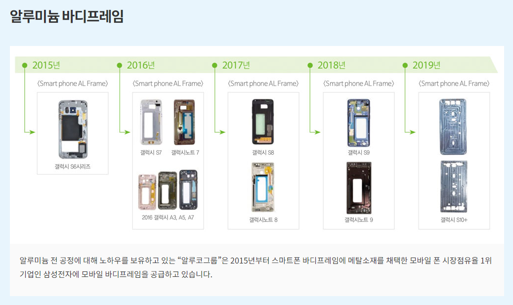 갤럭시 S시리즈, 노트 시리즈 등에 들어가는 알루미늄 바디 프레임을 알루코가 만든다고 합니다.