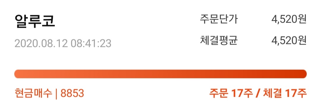 저는 알루코가 3일 연속 상한가를 친 2020년 8월 13일, 장이 열리기도 전에 상한가인 4,520원에 매수를 걸어놨었습니다.