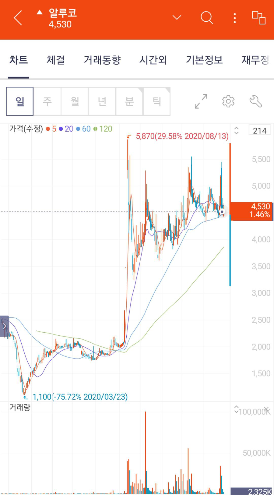 저는 알루코를 한 주당 4,520원에 매수했는데, 그럼 지금 알루코 주가는 어떠할까요?