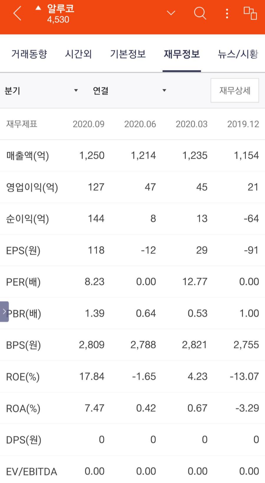 올해 2020년 3분기에 알루코의 매출액, 영업이익, 순이익이 눈에 띄게 늘어났다는 것을 볼 수 있습니다.