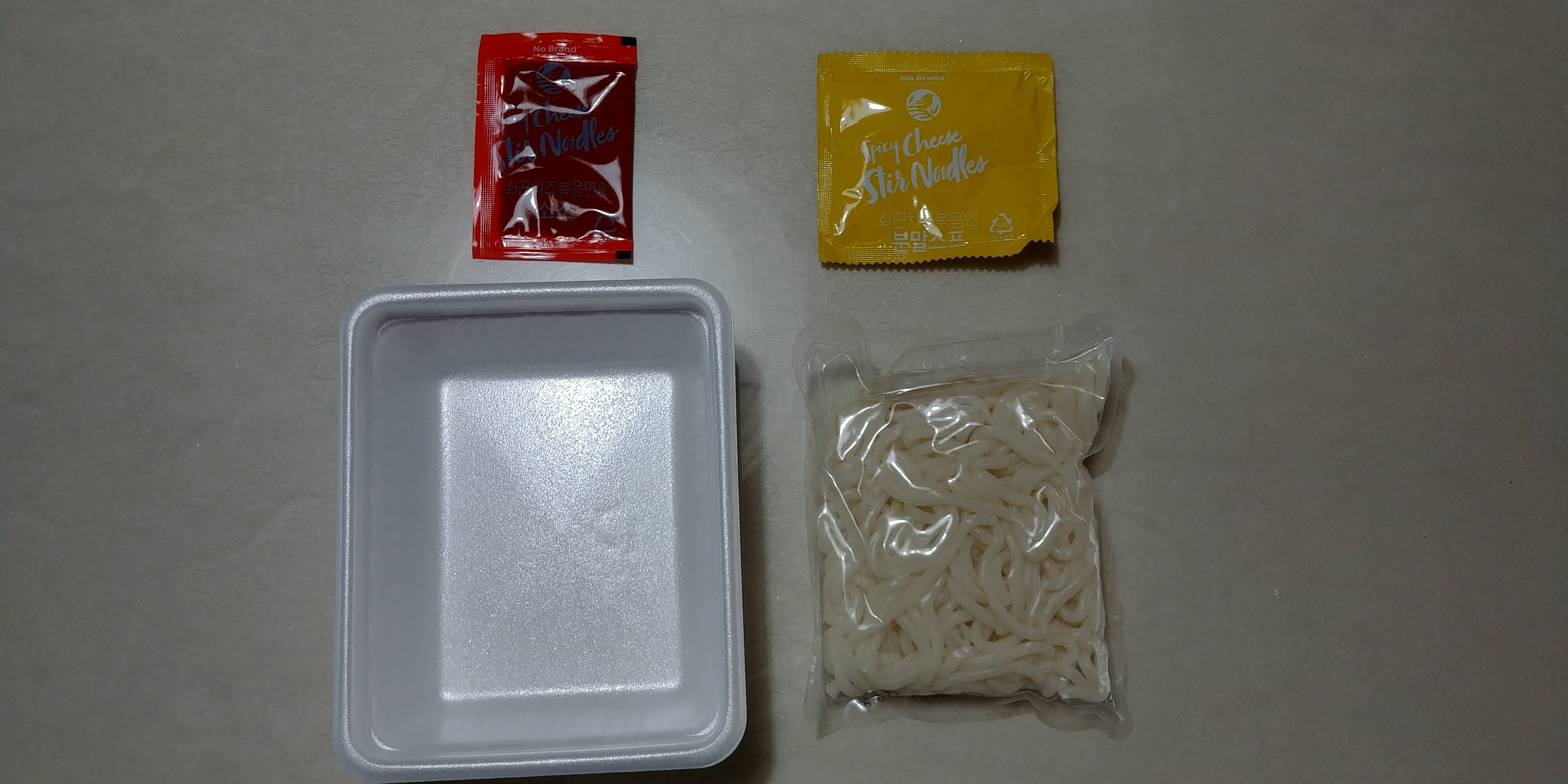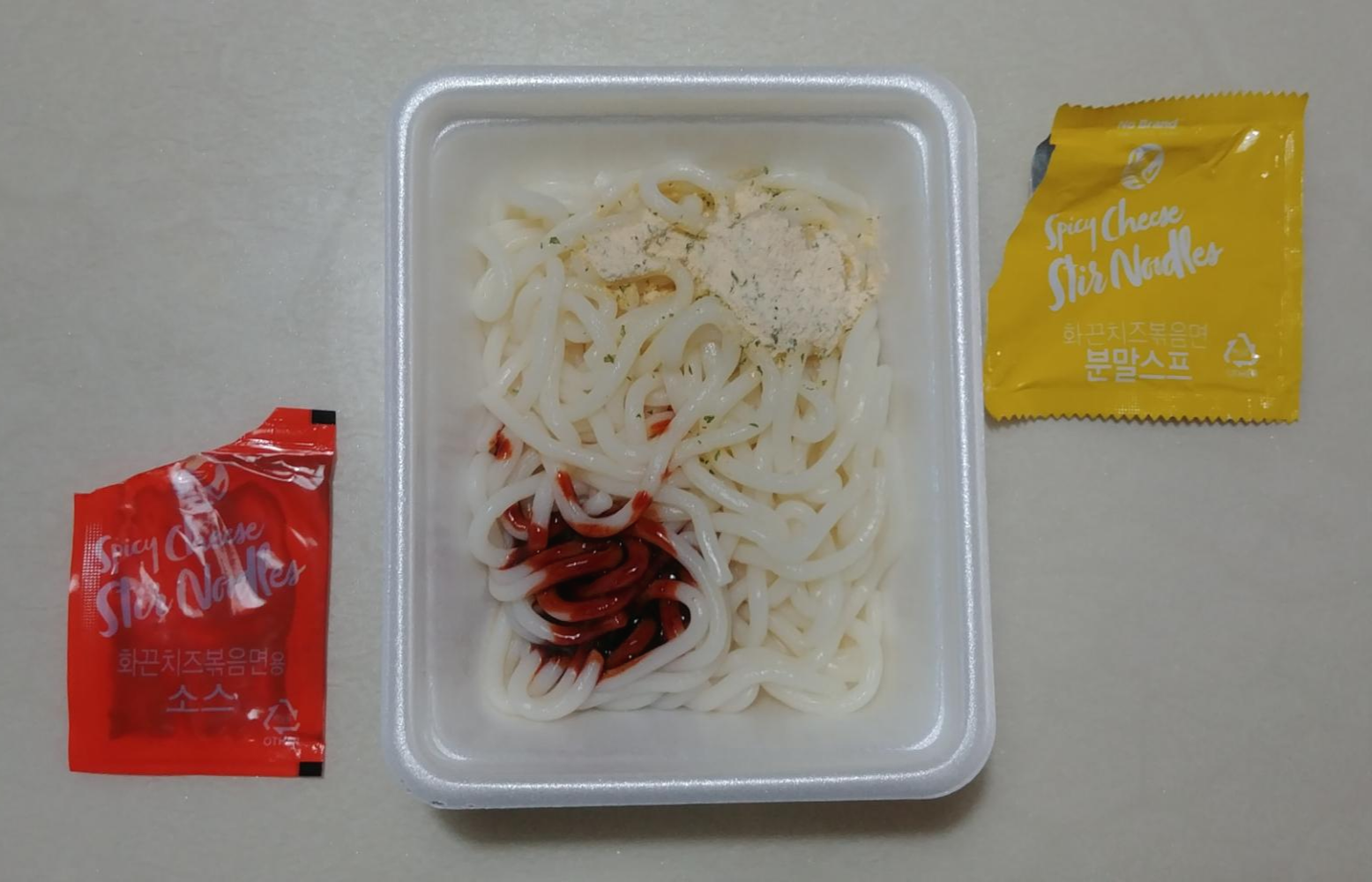 요렇게 생겼습니다. 매운맛을 책임지는 액체 스프, 치즈 맛을 내주는 치즈 분말 스프, 우동면 같이 생긴 면, 그리고 스티로폼 용기로 구성되어 있습니다.