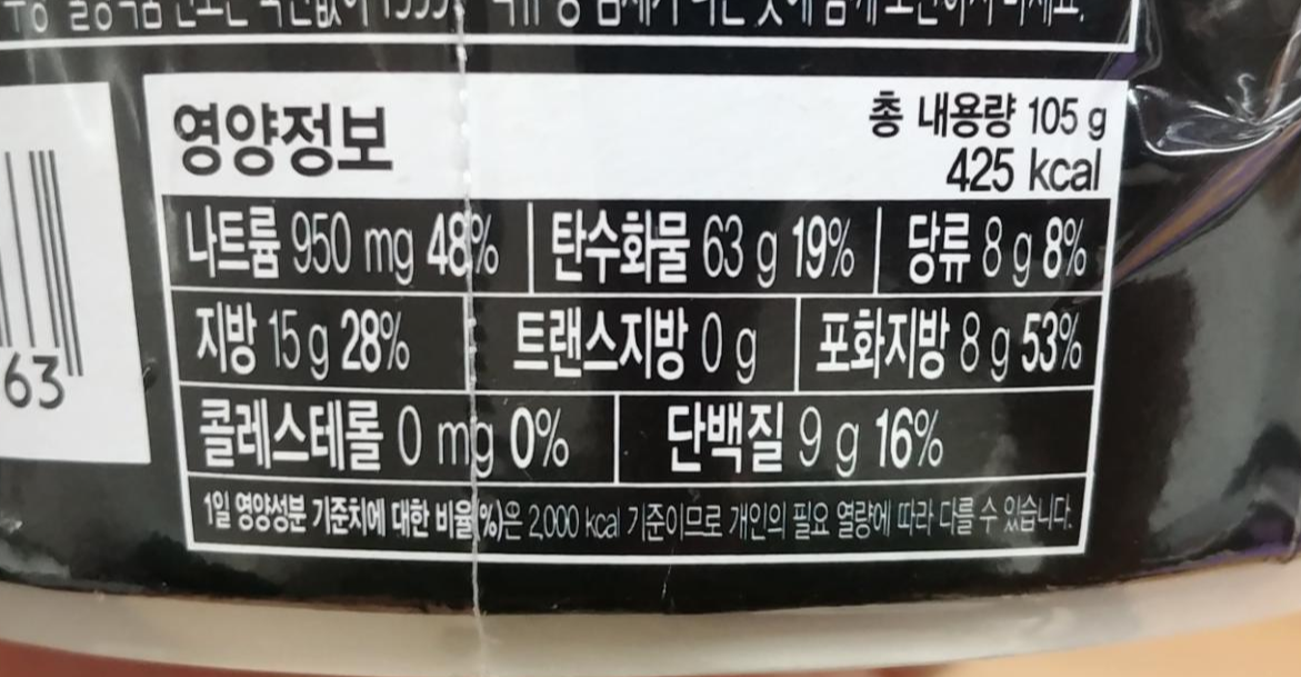 눈여겨서 볼만한 특이사항은 없습니다. 보통 컵라면이 가지고 있는 영양정보와 비슷합니다. 그래도 비교할 대상이 있어야 비슷한지 알 수 있기 때문에, 매운 볶음면의 대표 주자인 불닭볶음면의 영양정보를 가져와 봤습니다.