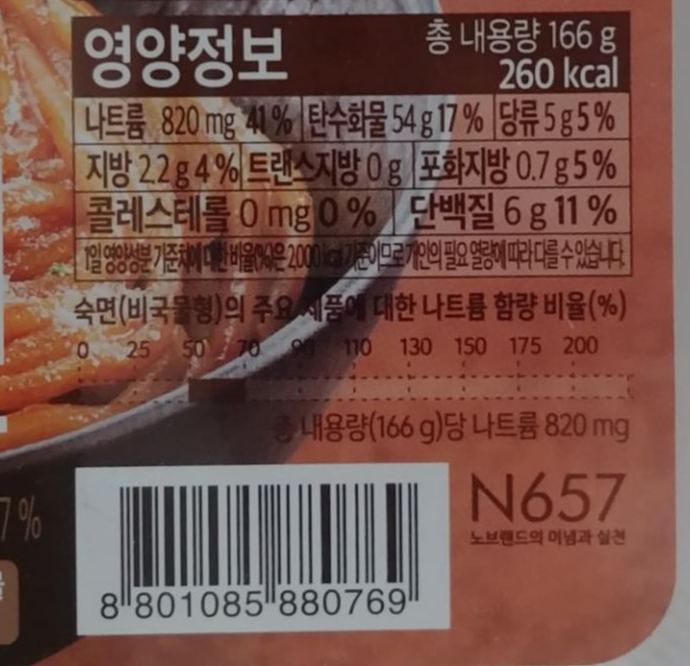 먼저 노브랜드 화끈 치즈볶음면의 영양정보를 살펴보도록 하겠습니다.