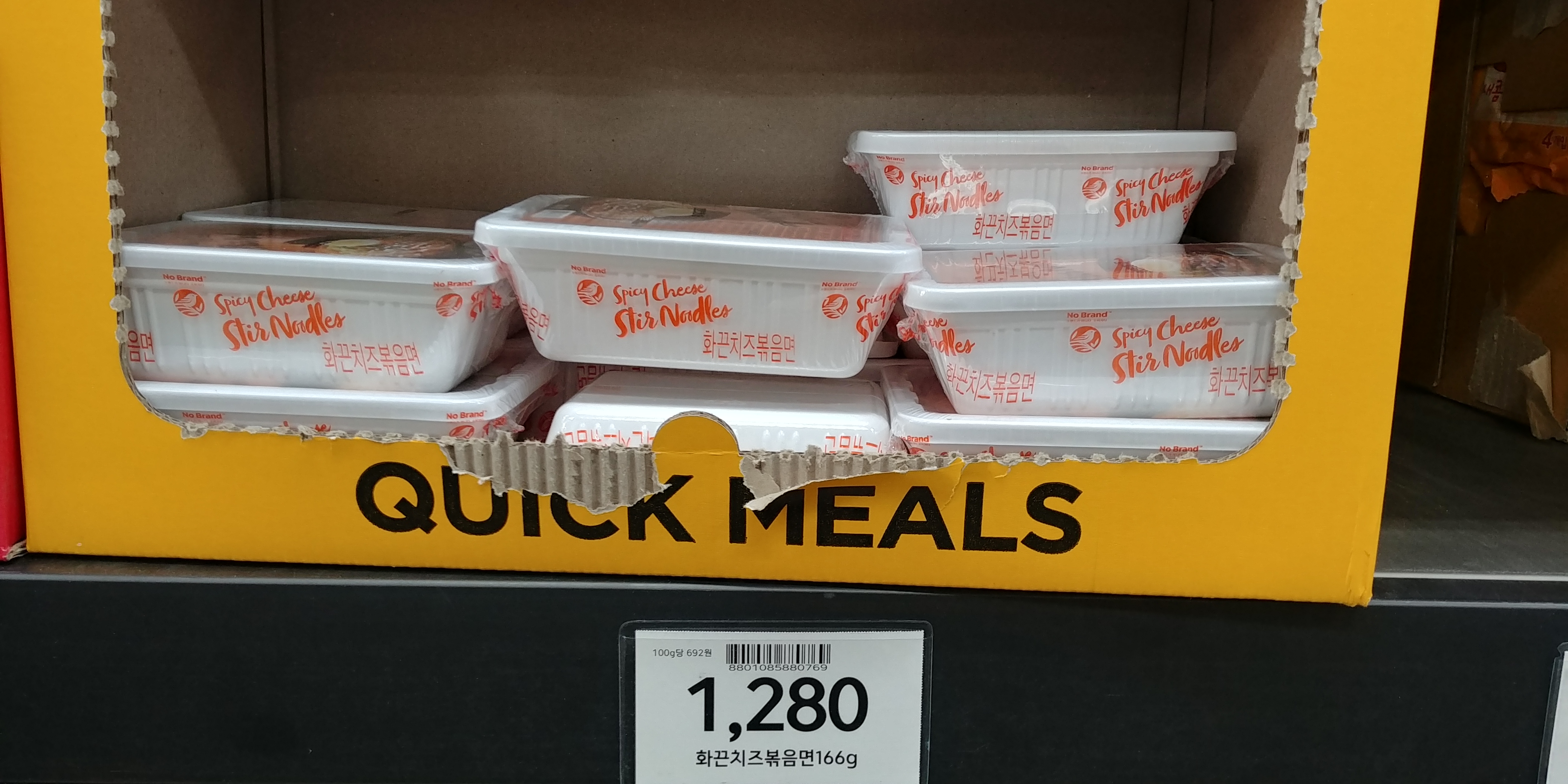 가격은 166g에 1,280원입니다. 지금까지 리뷰했던 노브랜드 제품들은 가성비가 뛰어났지만, 이 노브랜드 화끈 치즈볶음면은 그다지 가성비가 좋은 것 같진 않습니다.