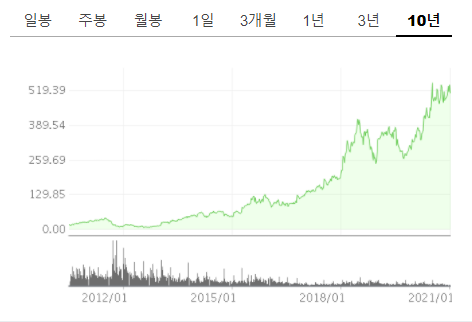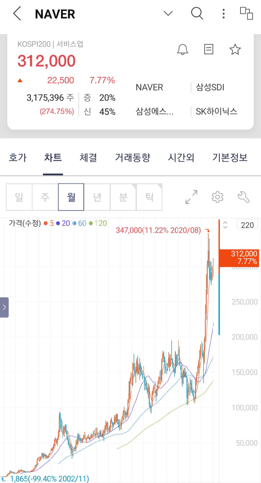 또한 위의 네이버 주가 월봉 차트를 보시면 아시겠지만,