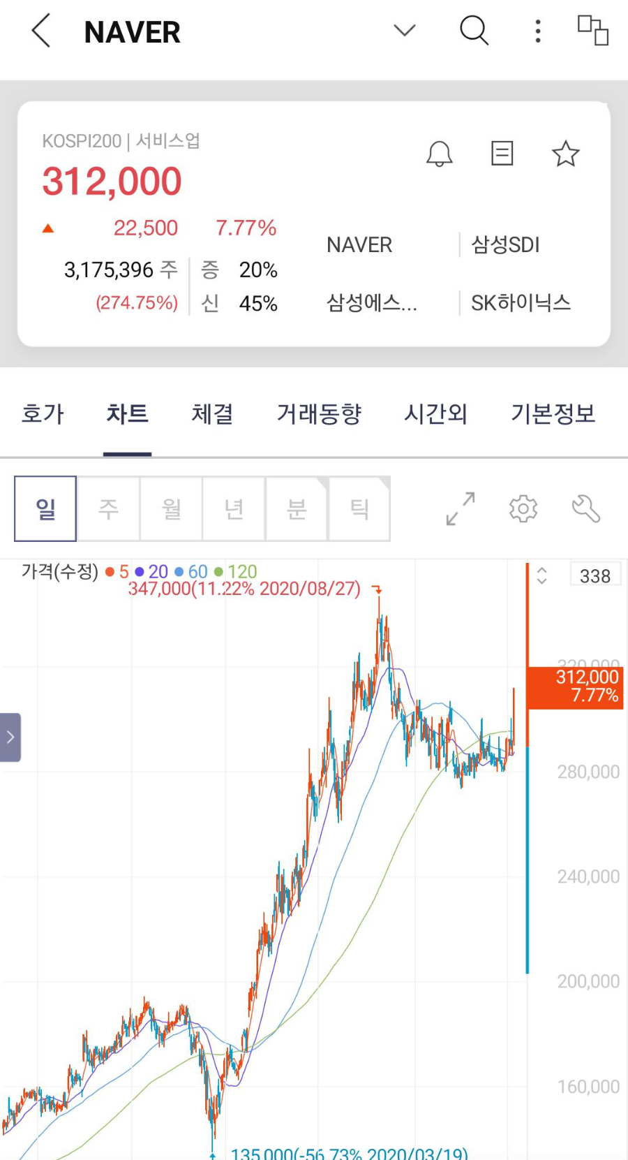 그 전에도 네이버 주식을 조금 가지고 있었지만, 이번 기회에 한 주를 추가로 매수했습니다.