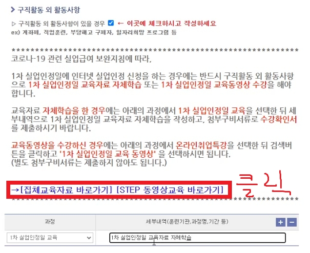 과정에는 '1차 실업인정일 교육'을, 세부내역에는 '1차 실업인정일 교육자료 자체 학습'을 적어주시면 됩니다.