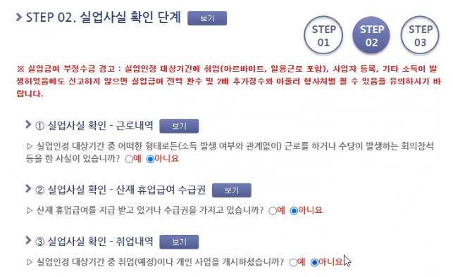 다음으로 실업사실 확인단계에 해당 내용을 체크해주시면 됩니다.