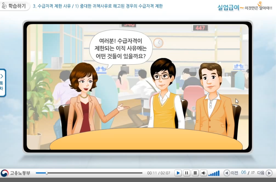 지루하긴 하지만 생각보다 실업급여 신청과 수급에 대한 설명을 이해하기 쉽게 해 놓았으니 다 보시는 것을 추천드립니다(믿기지 않으시겠지만, 저는 열심히 다 시청했습니다).