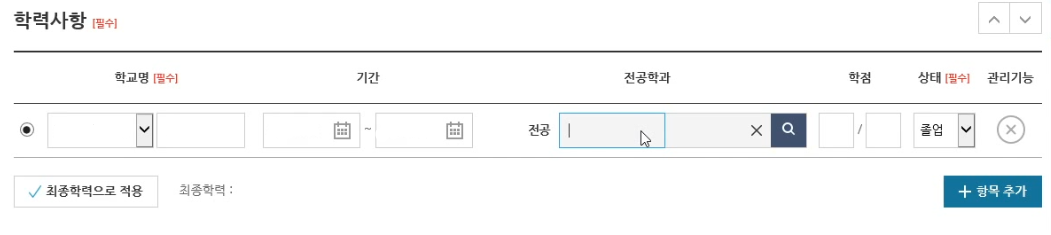 위와 같은 학력사항, 희망 근무지역을 작성해주시면 됩니다.