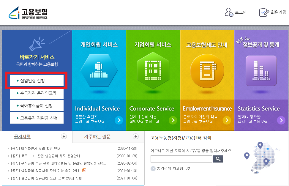 검색창에 고용보험을 치시면 맨 위에 사이트가 뜹니다. 거기로 접속하시면 됩니다.
