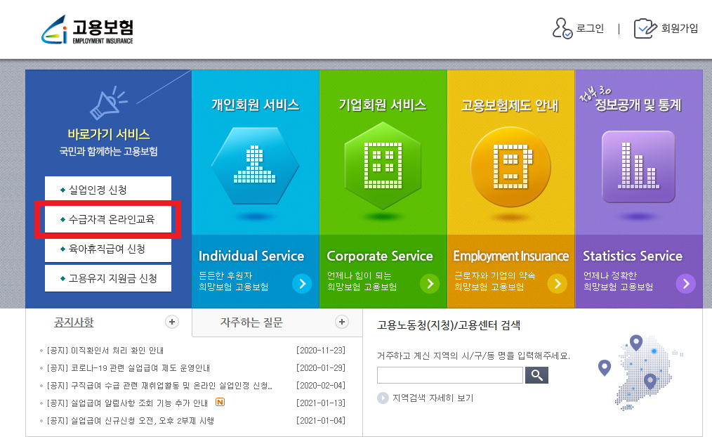수급자격 온라인 교육을 수강하기 위해서는 고용보험 홈페이지로 들어가야 합니다.