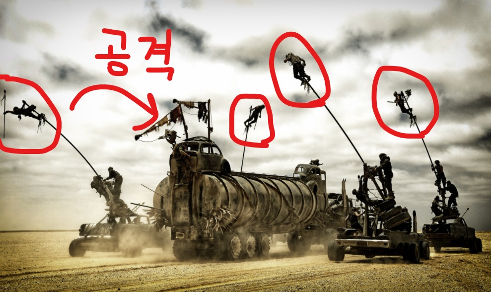 저렇게 양옆으로 진자운동을 하는 막대기 끝에 사람이 올라타서 석유 트럭에 폭탄이 달린 창을 던지는 공격을 한다.
