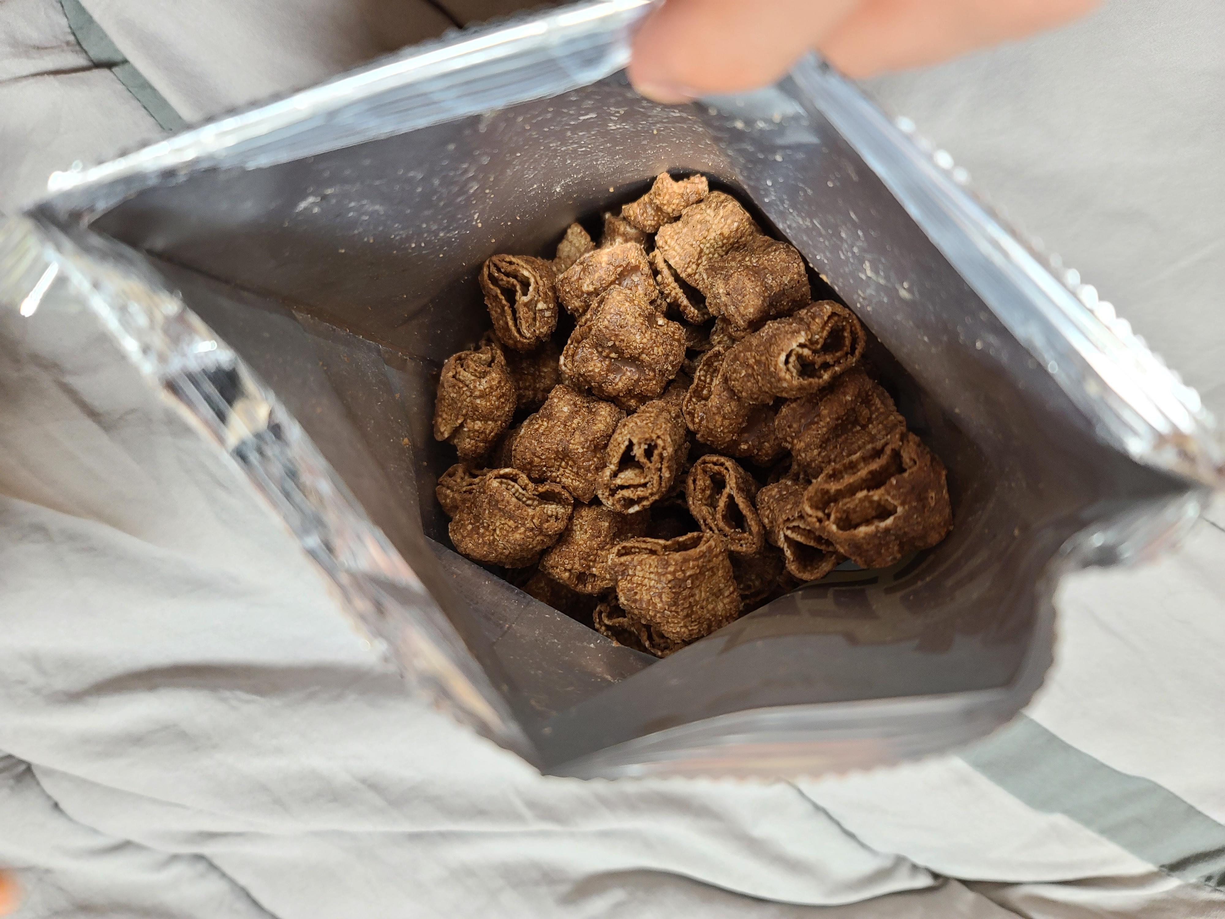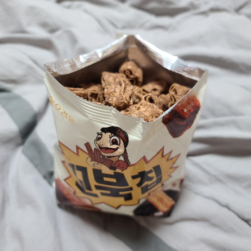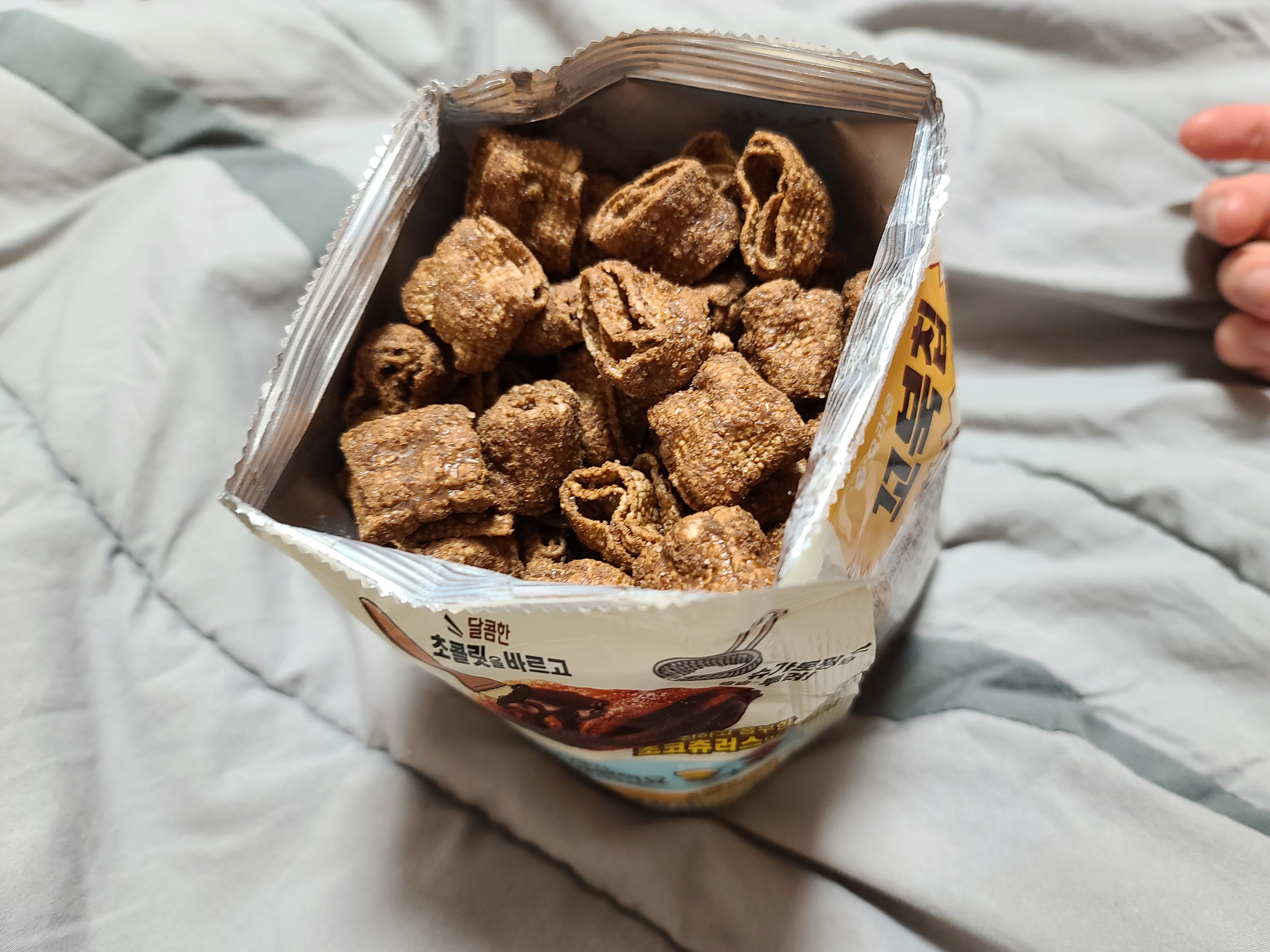 과자의 겹겹마다 초코 코팅이 아주 잘 되어있어서 초코맛이 2배로 더 잘 느껴질 뿐만 아니라 네 겹인 꼬북칩의 바삭한 식감과 잘근잘근 씹히는 네겹 초코 코팅의 식감이 아주 일품입니다.