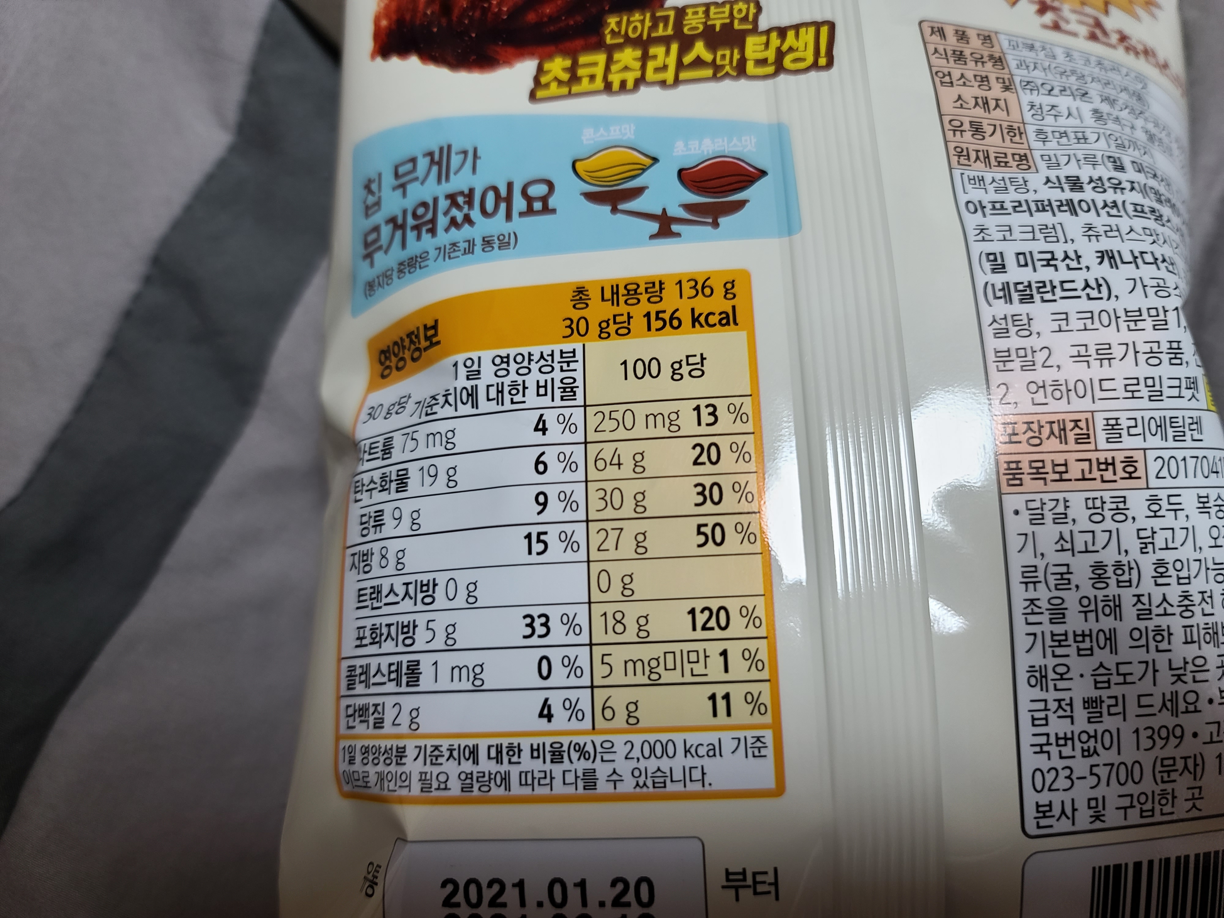 총 내용량이 136g이니까 이 꼬북칩 초코츄러스를 한 번에 다 드시면 그자리에서 약 700kcal를 뚝딱 하실수 있습니다.