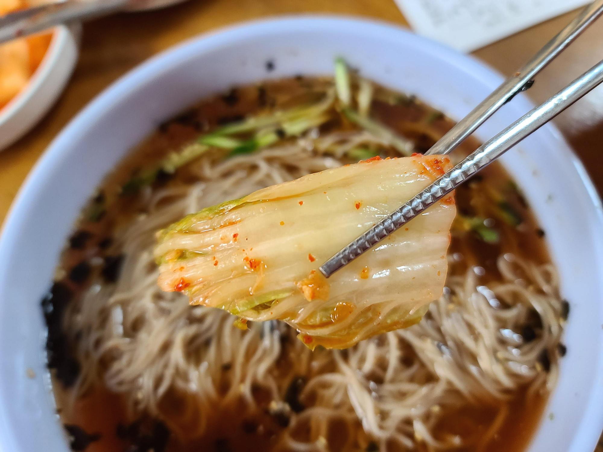먼저 맛을 말씀드리면, 새콤하고 시원한 물막국수 맛입니다.