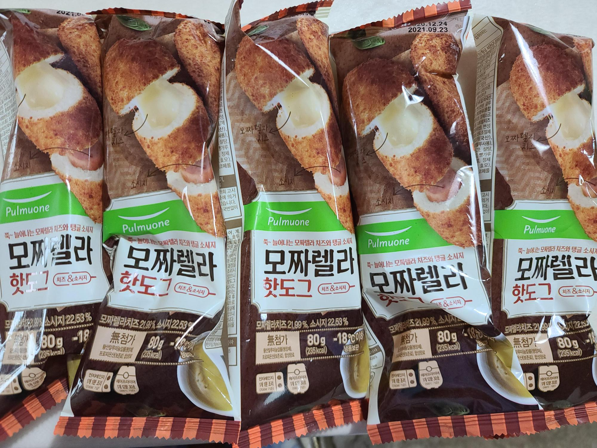 위의 사진을 보시면 아시겠지만, 풀무원 모짜렐라 핫도그는 낱개로 5개가 소포장되어있습니다.