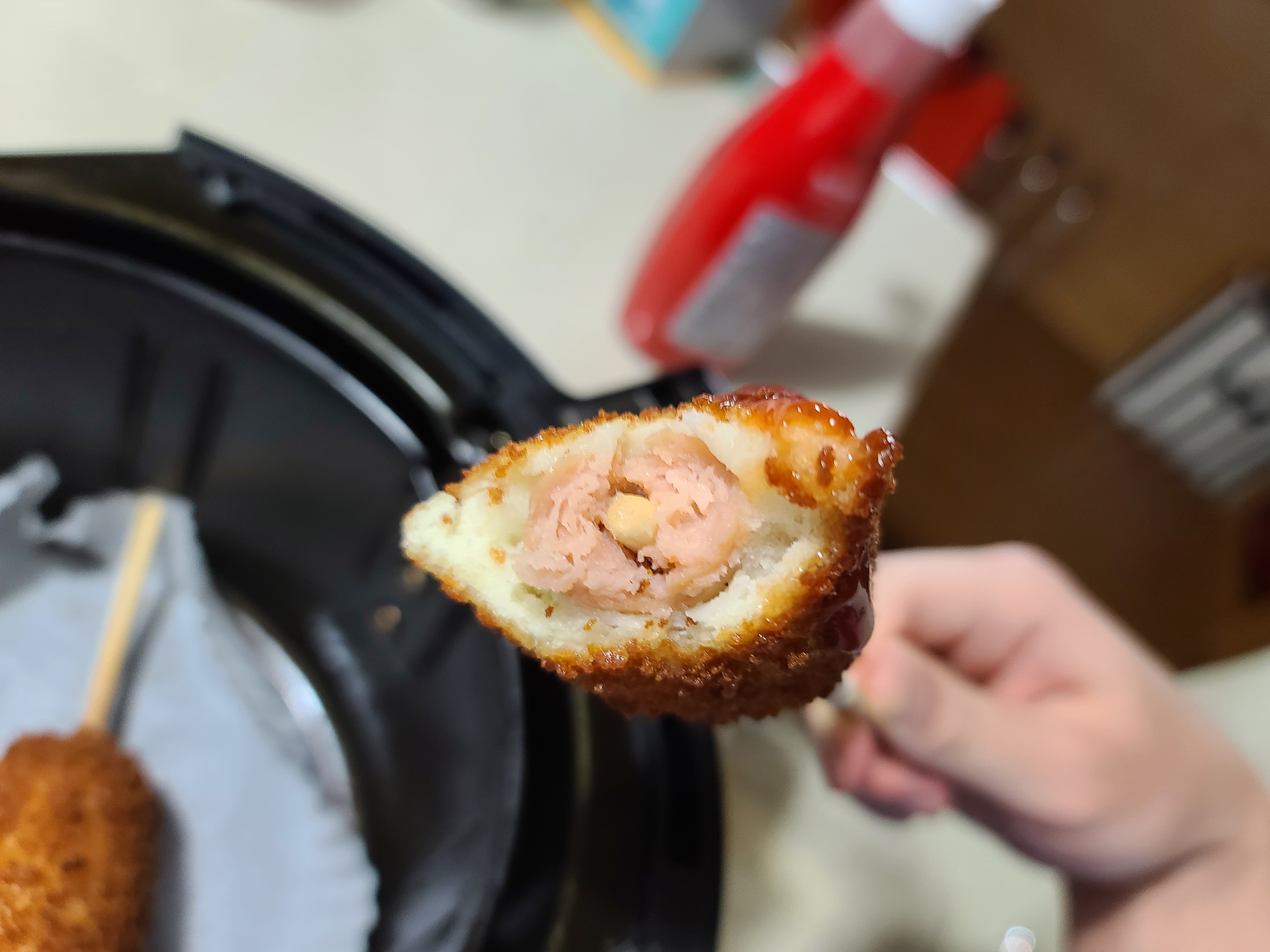 확실히 위의 핫도그와는 다르게 겉면에 빵가루 같은 것이 묻어있어서 훨씬 더 바삭바삭했습니다.