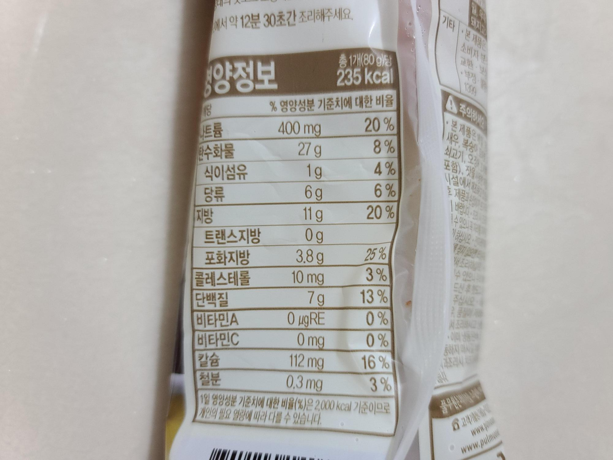 풀무원 모짜렐라 핫도그는 1개당 235kcal라는 것을 알 수 있습니다.