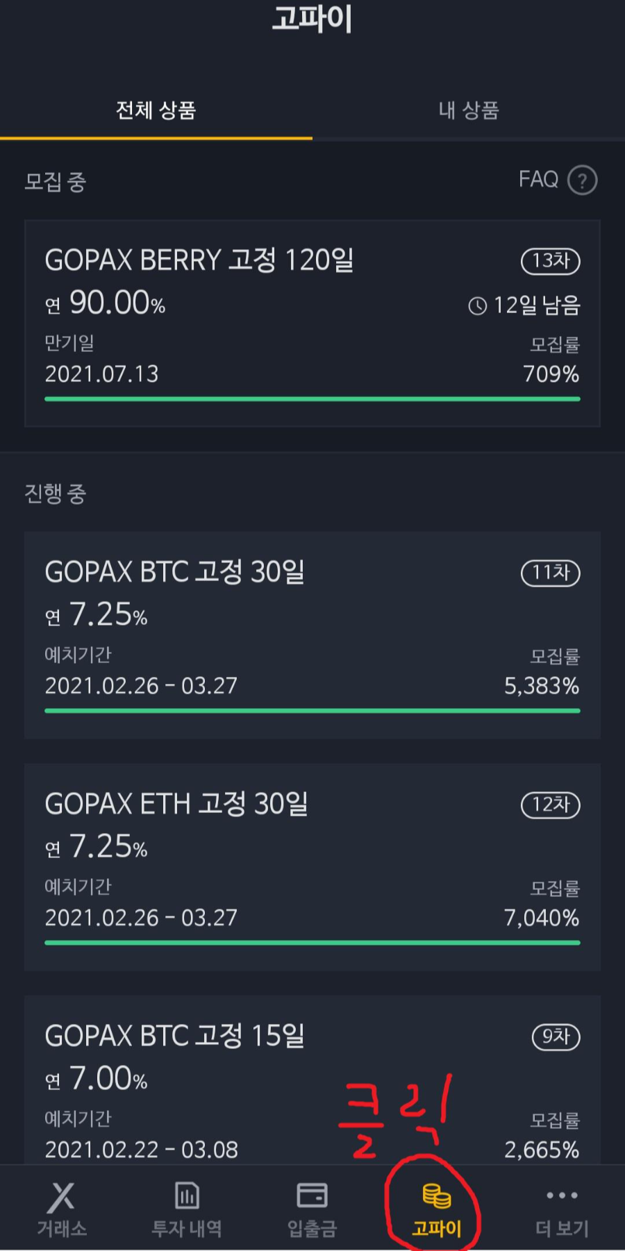 고팍스 거래소 어플 하단의 고파이를 눌러주시면, 위의 사진과 같이 여러 가지 투자상품들이 있습니다.