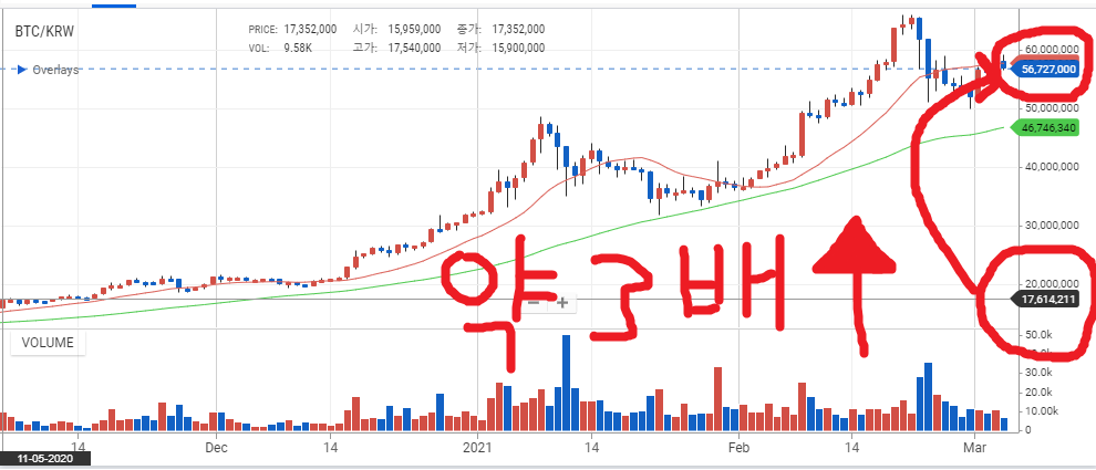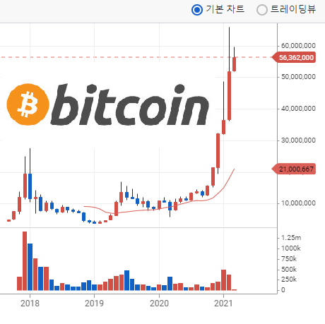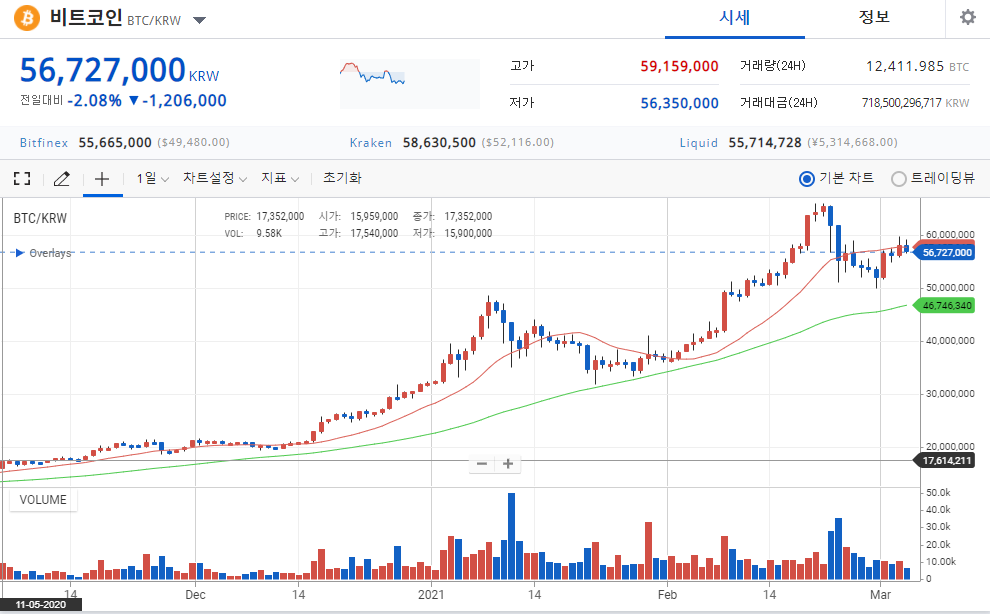 2020년 05월 11일에 약 17,000,000원 하던 1 비트코인 시세가 2021년 03월 04일 현재는 1 비트코인이 약 56,000,000원에 거래되고 있다는 것을 알 수 있습니다.