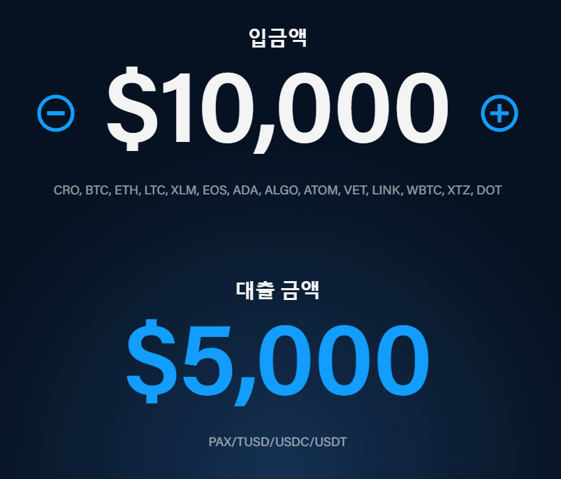 이런 식으로 크립토닷컴체인 등의 가상자산을 입금하고, 그 입금액의 50%까지 대출을 해주는 시스템입니다.